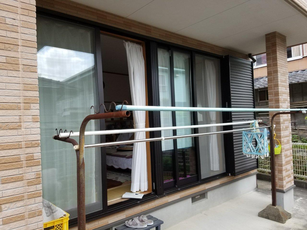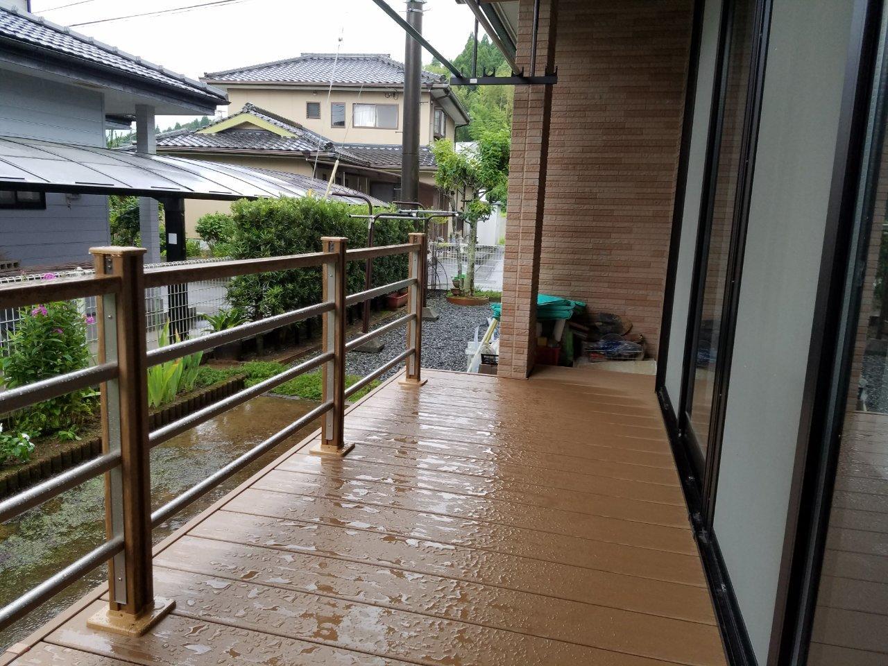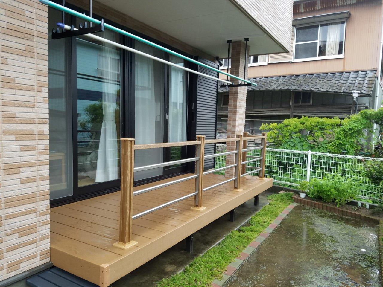 ウッドデッキ:LIXIL樹ら楽ステージ(人口木) 色:クリエペールA ウッドデッキ設置に合わせ、吊り下げ式の物干しも取り付けました。