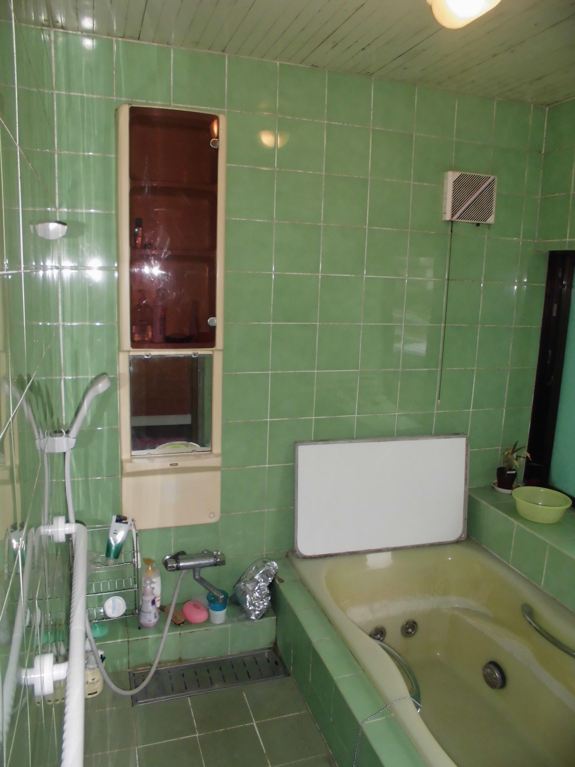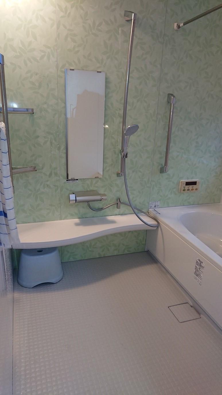 タイル張りの浴室から、システムバスにリフォームさせていただきました。グリーンのアクセントパネルがステキです!