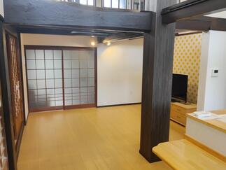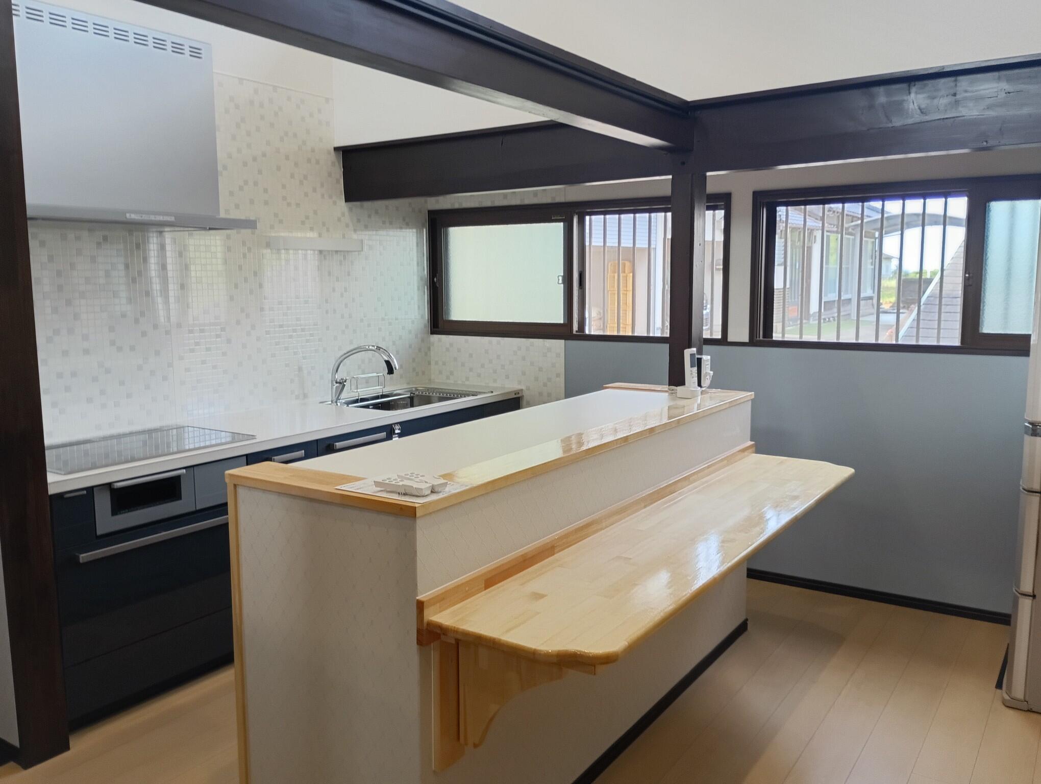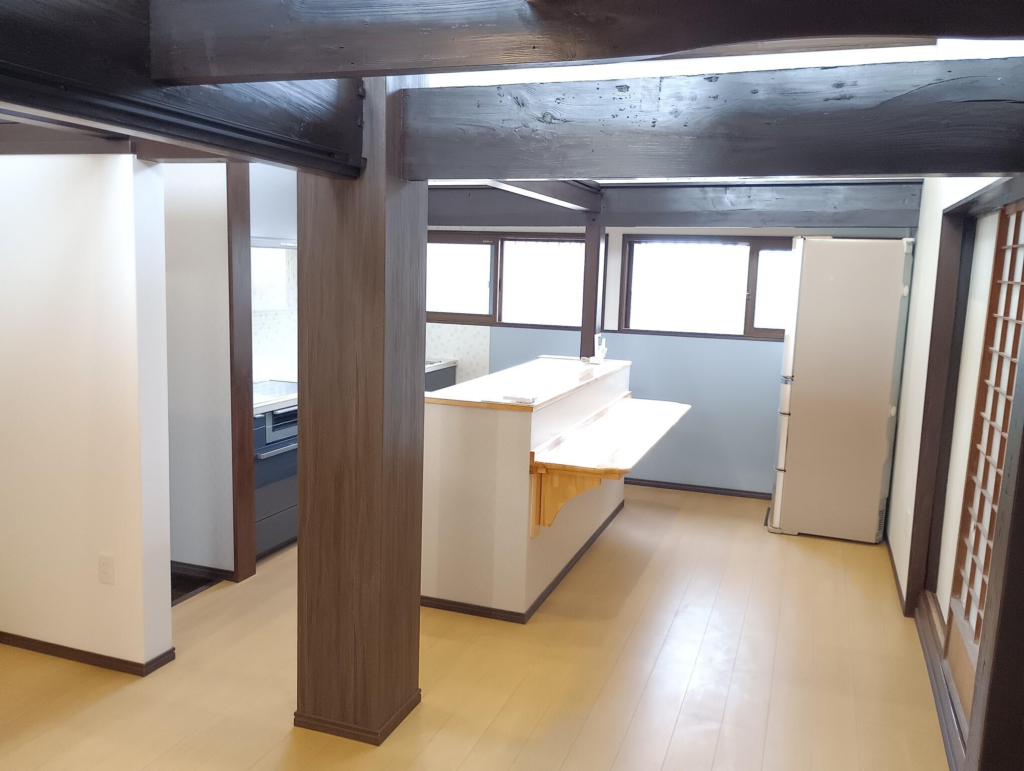 設備も古くなっていたので、キッチンと居間をつなげて天井を撤去して吹き抜けに、広々とした開放感のあるLDKになりました。