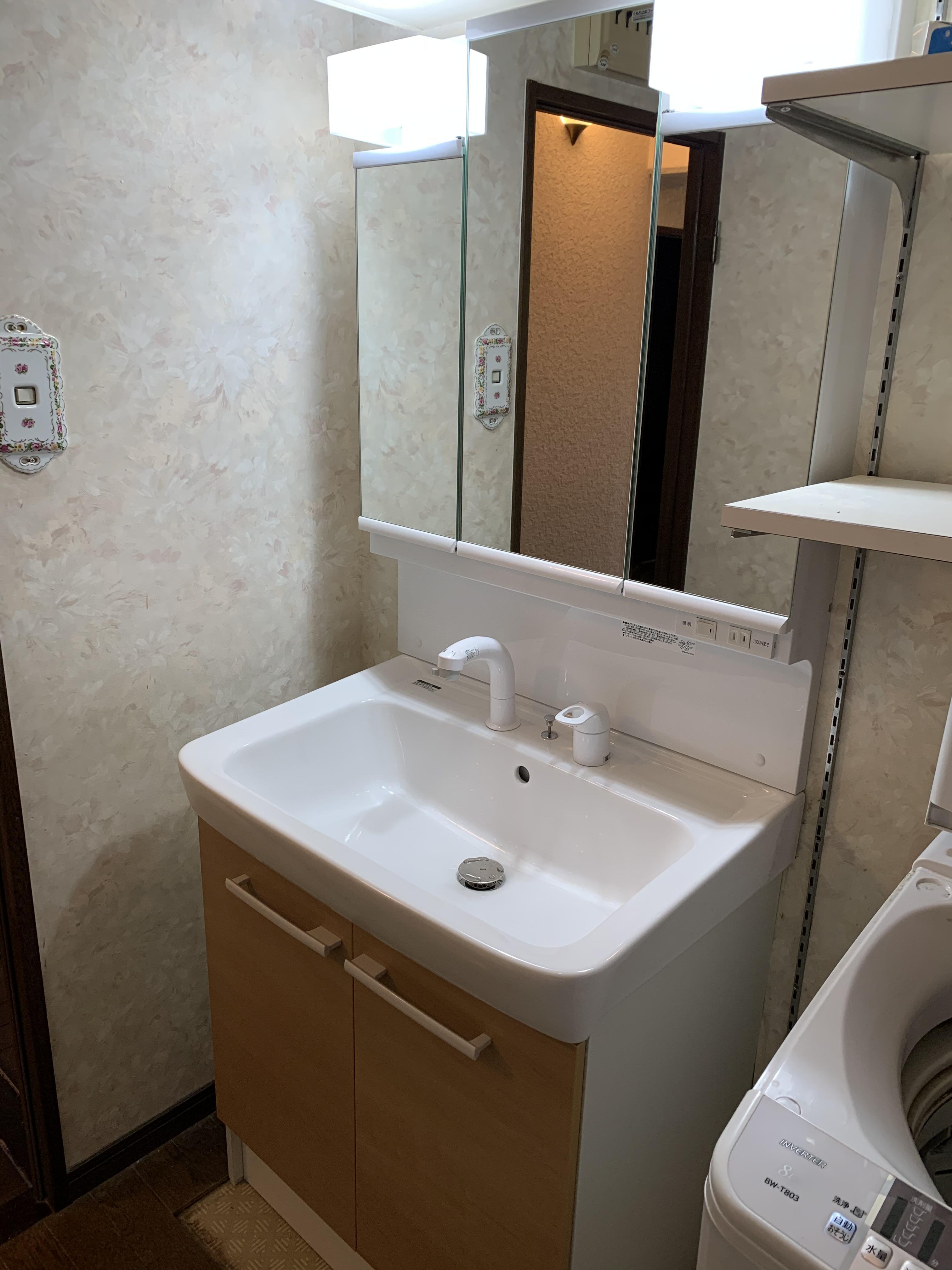 洗面化粧台をお取替えしました。 今回採用したLIXILの洗面化粧台オフトは、付け置き洗いができる大きさの大型洗面器が特徴です。 鏡の裏に小物を仕舞える全収納タイプの三面鏡となっているため、洗面廻りがスッキリ収まります。(参考工事価格 約15万円)