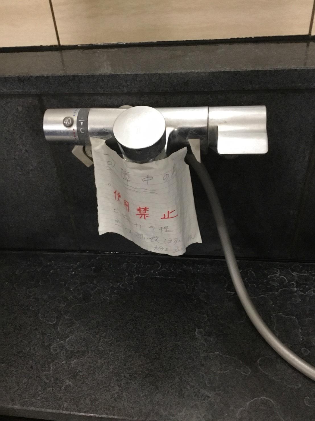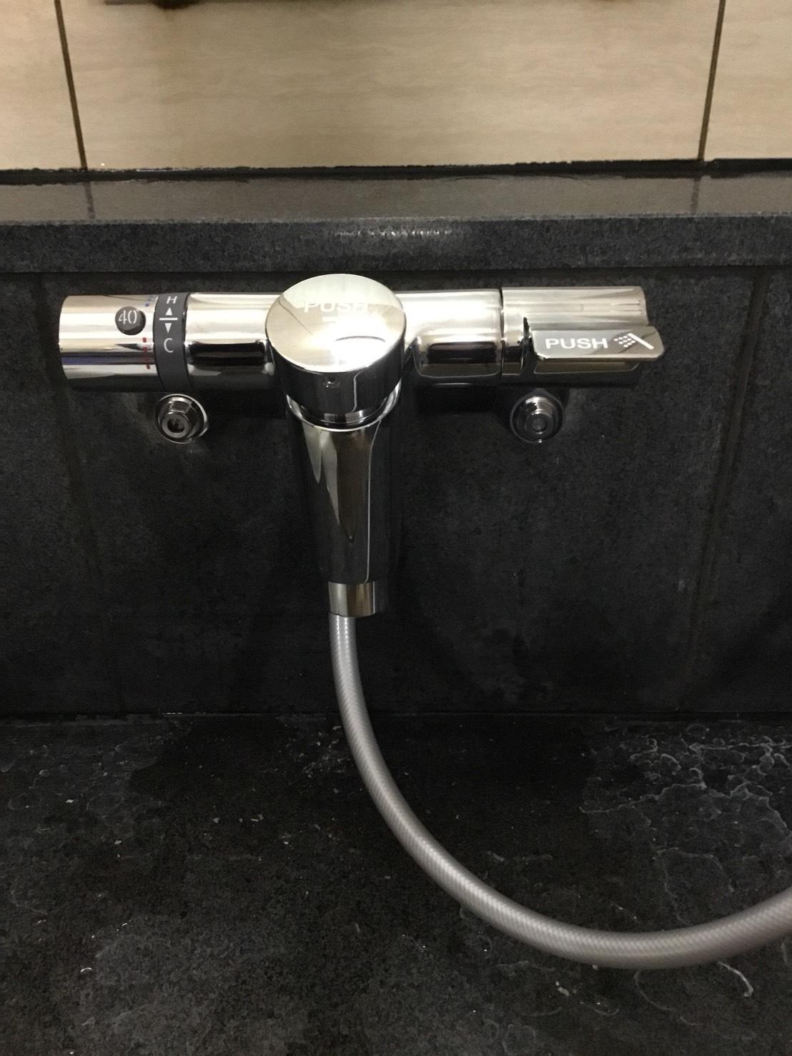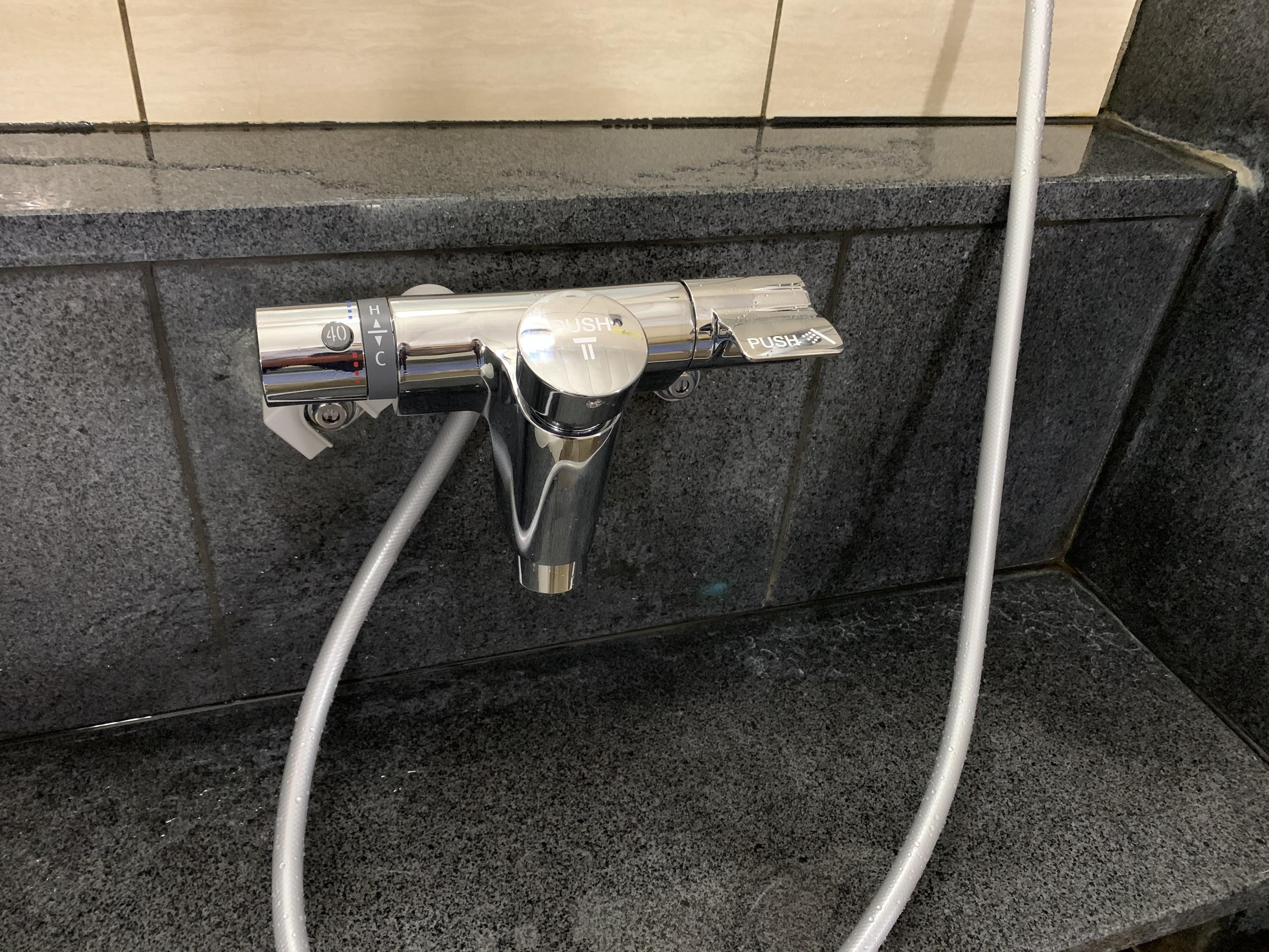 共同浴場の水栓を交換しました。 既存の水栓と同様、定量止め機能付きの節水仕様となっています。(参考工事価格 約9万5千円)