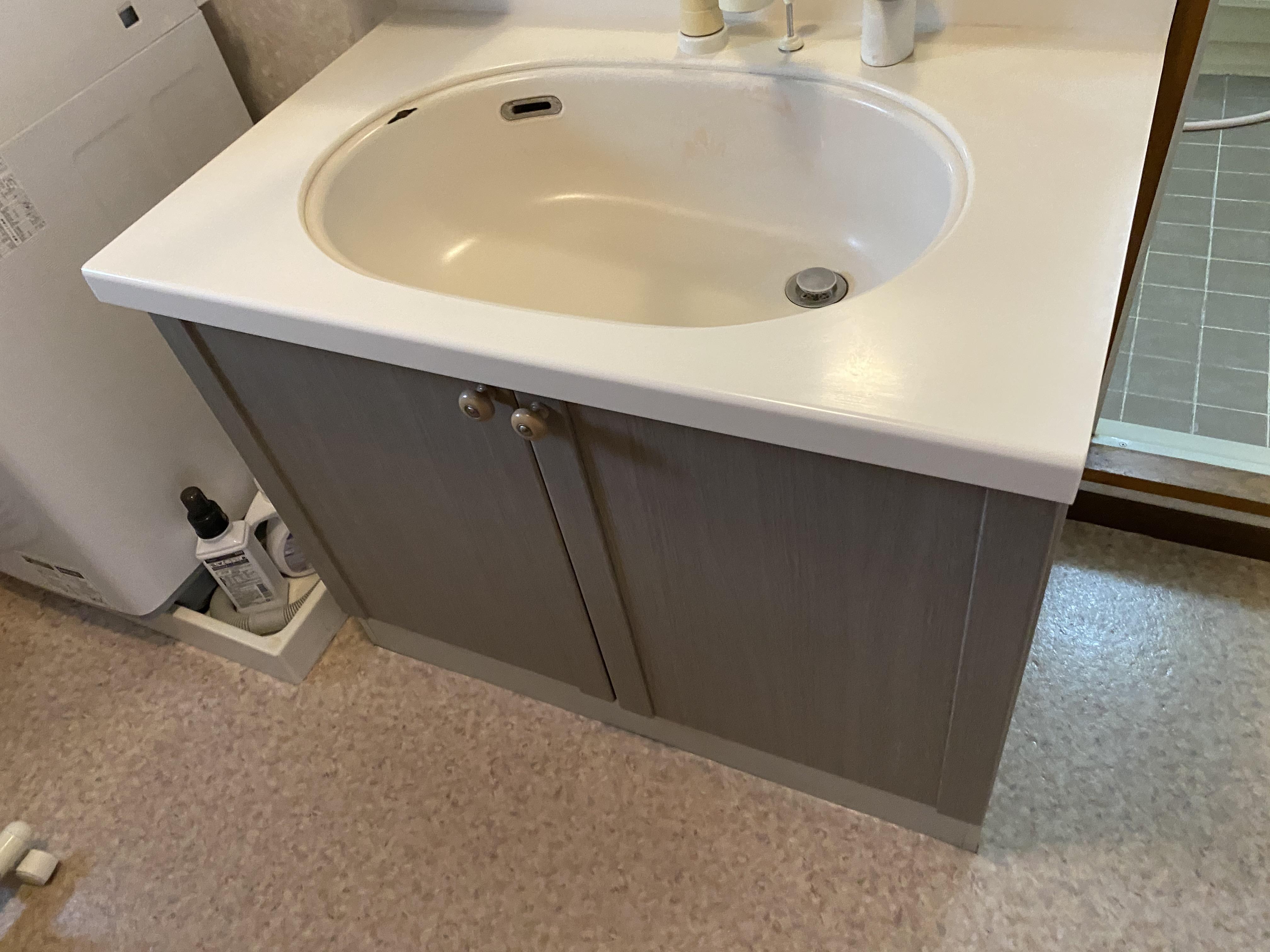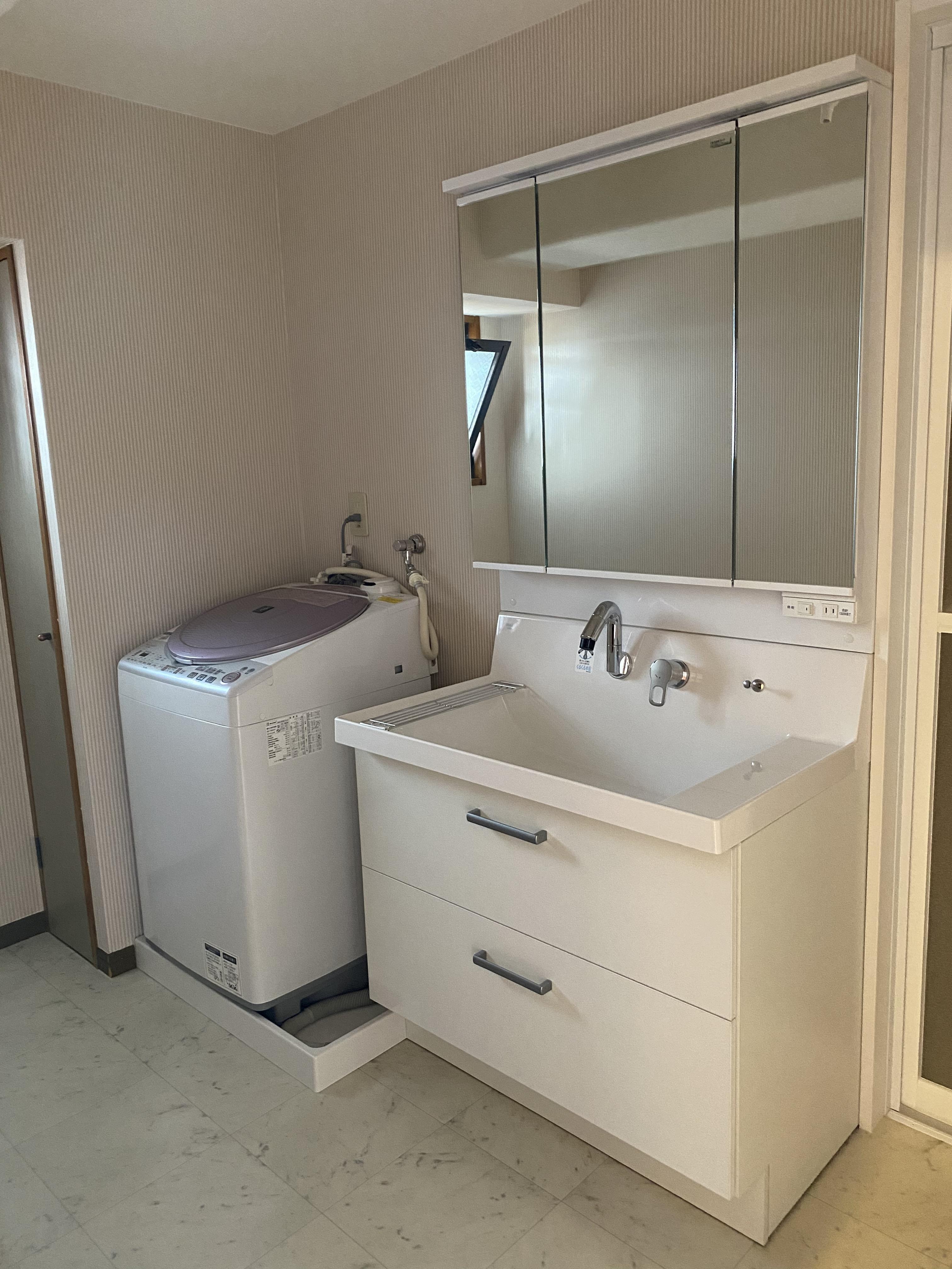 洗面化粧台をお取替えしました。 壁付けの水栓と、広いボウルになったことで 使い勝手が良くなりました。
