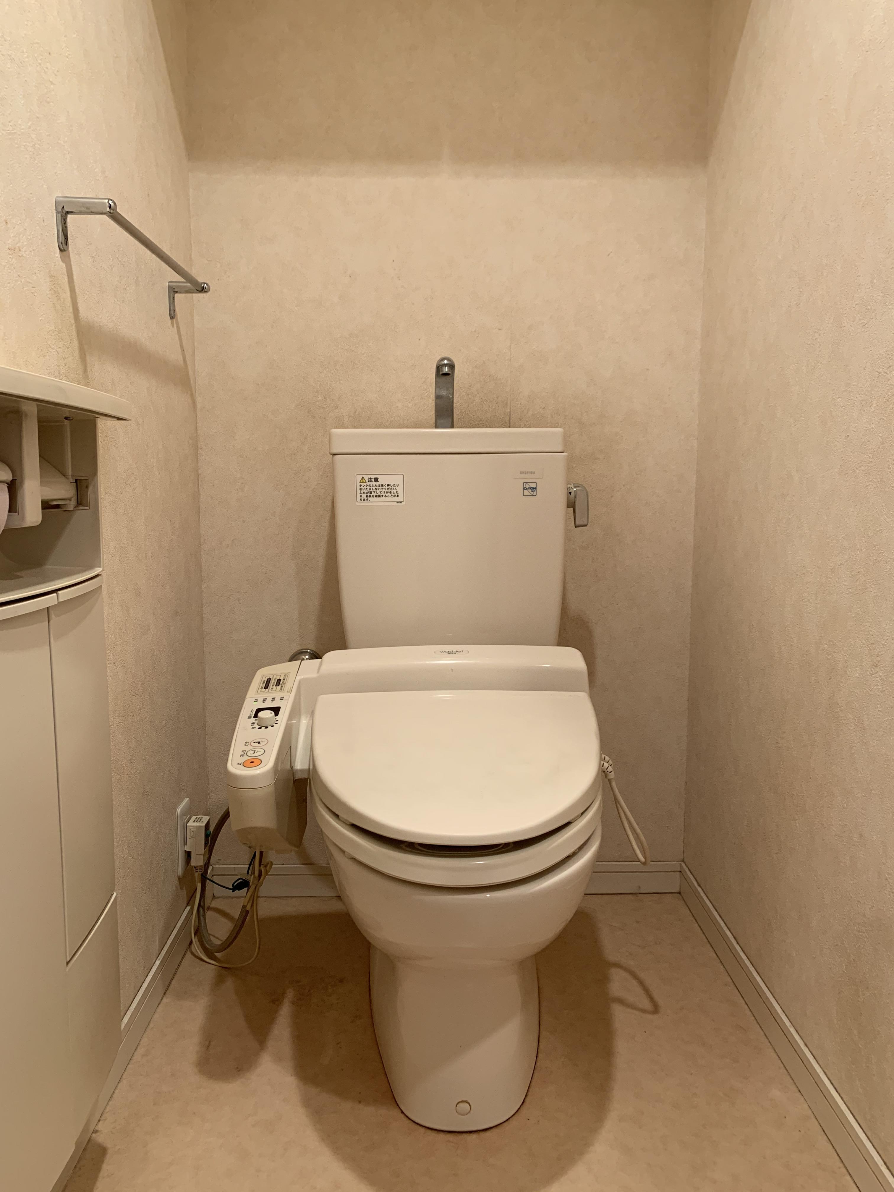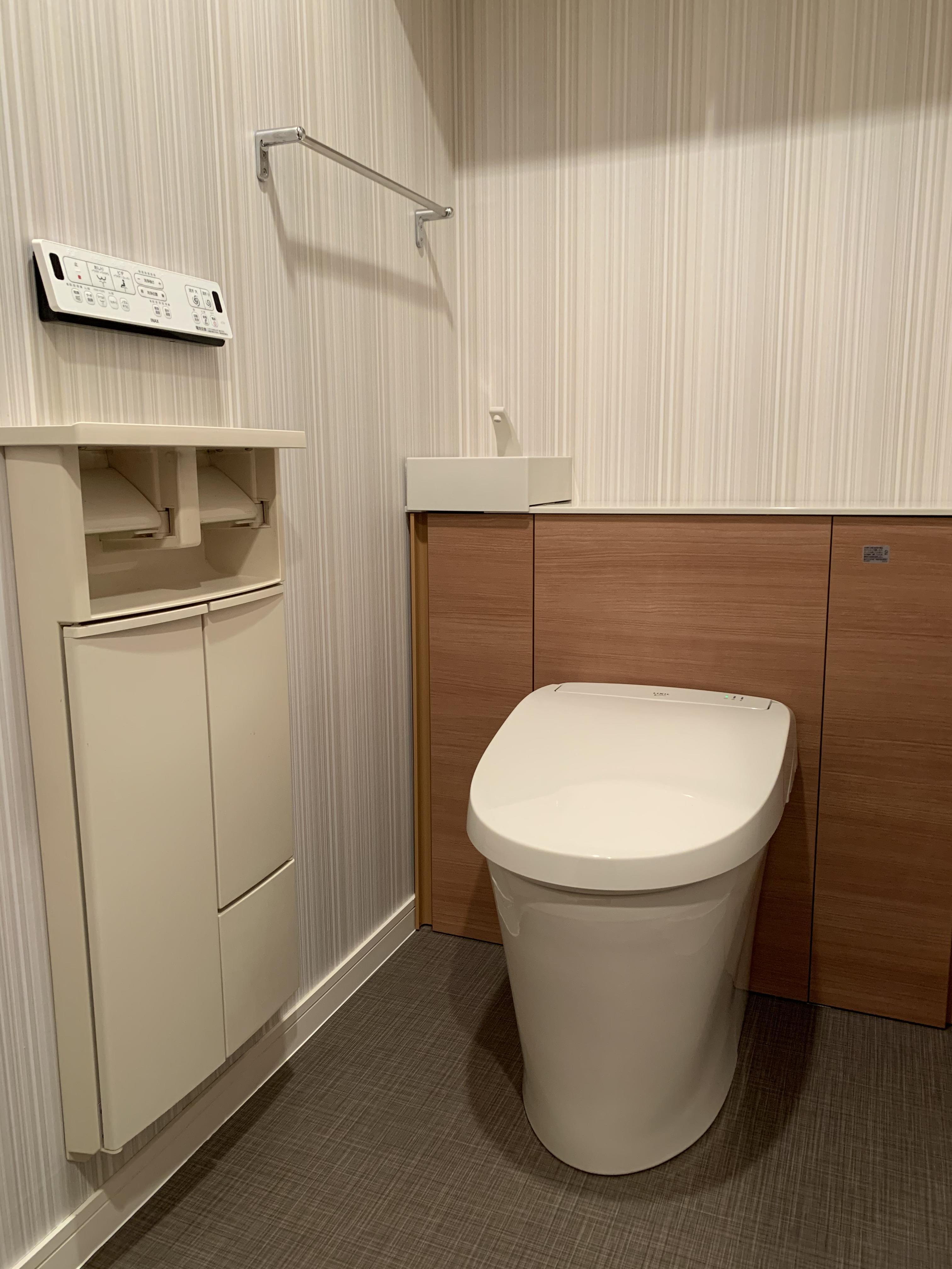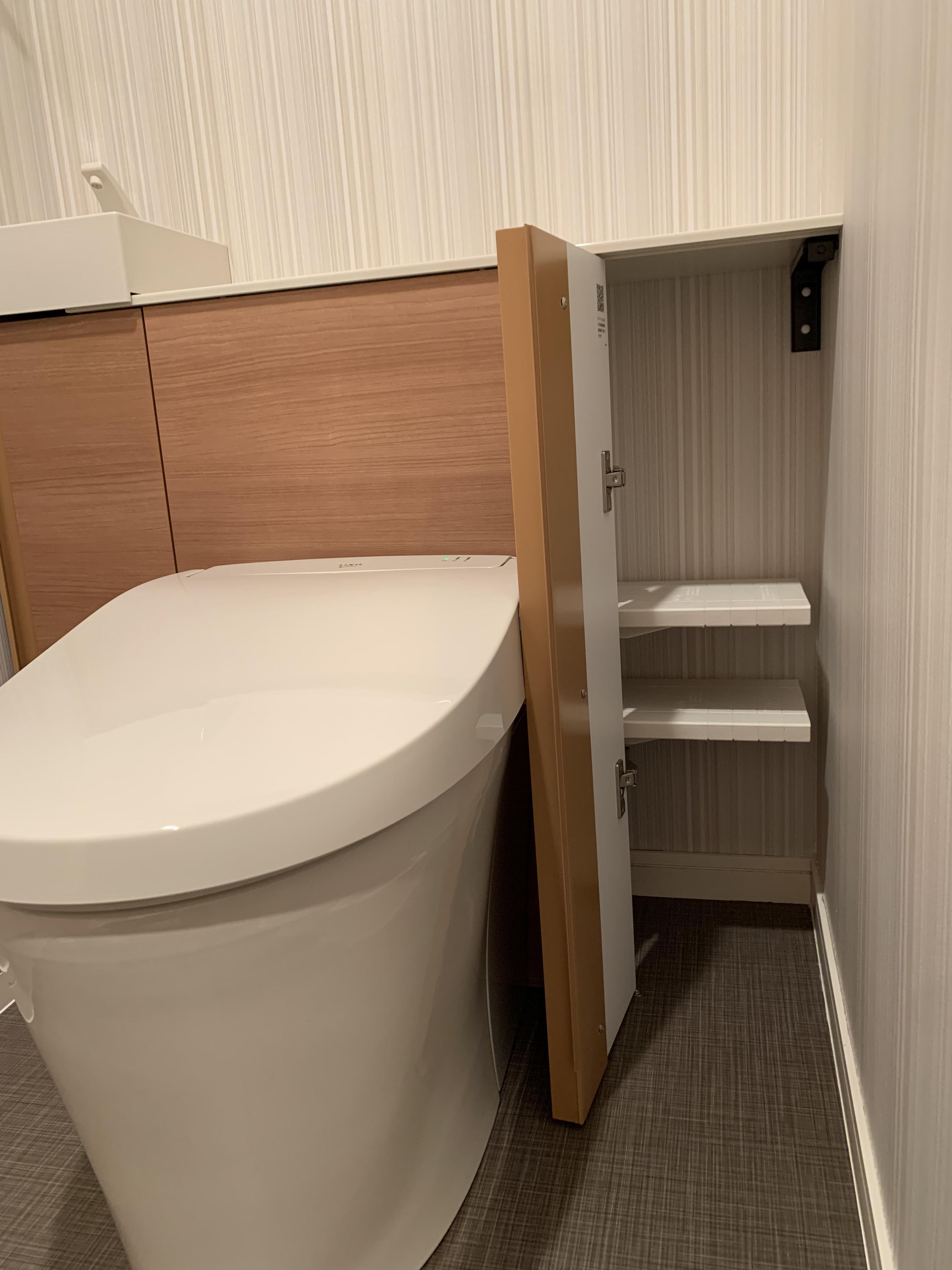 トイレのお取替えと、全体のクロス・CFシートを貼替えました。 埃が溜まりやすいタンク後ろの部分がキャビネットに隠れている為、 お掃除しやすくなりました。