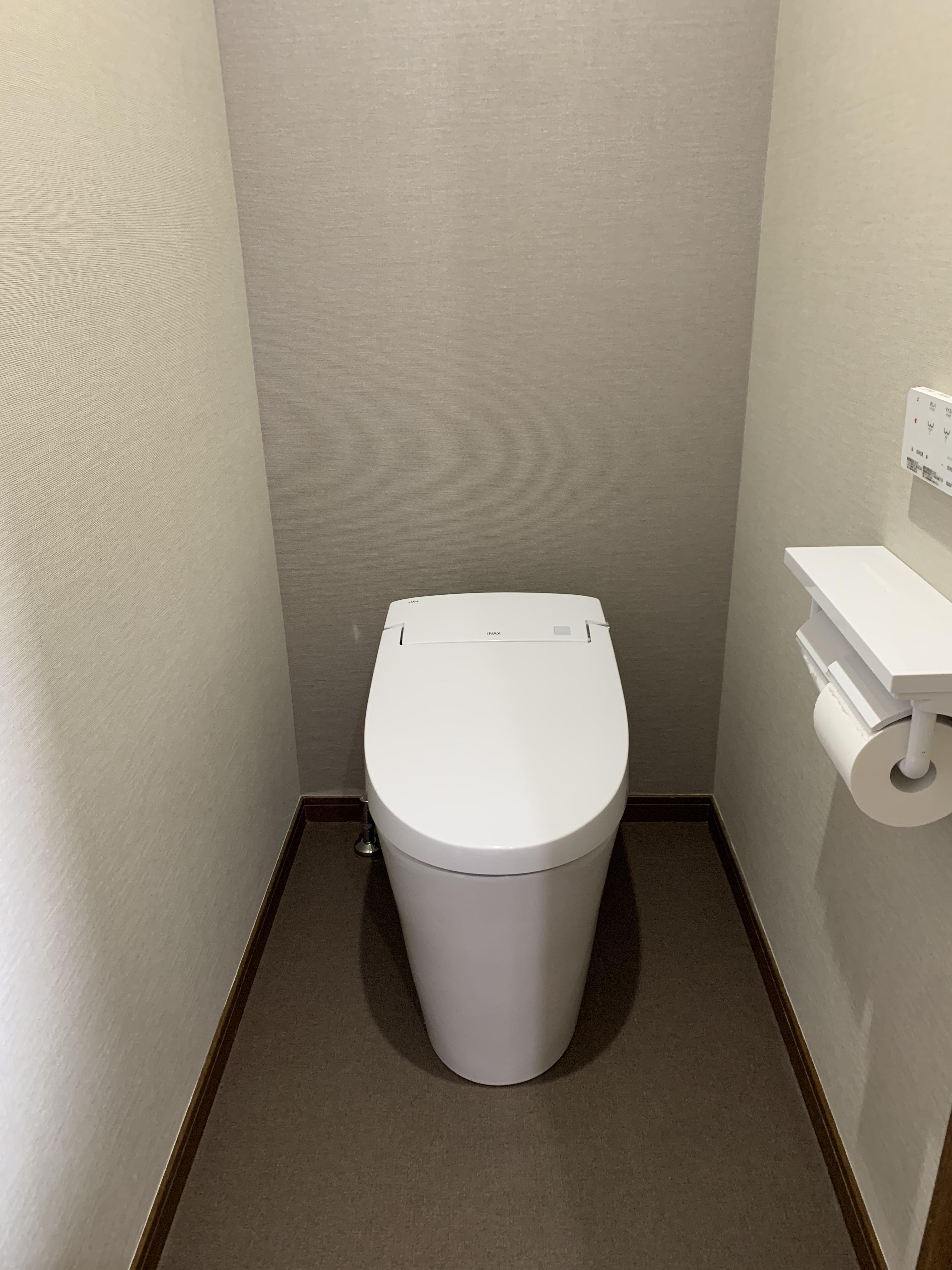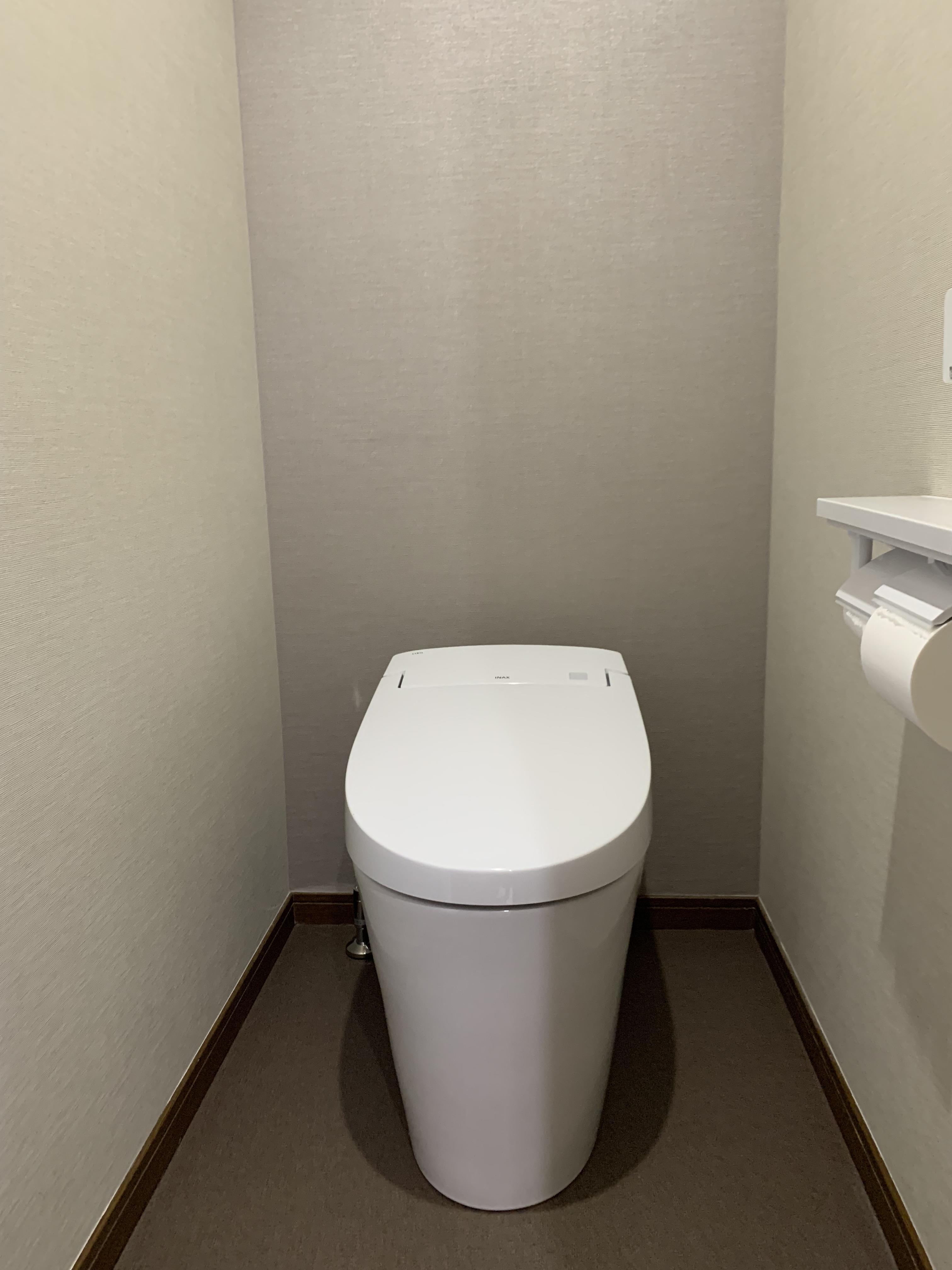 トイレのお取替えと、クロス、CFシートの貼替を行いました。 今回お選びいただきましたサティスSは すっきりとしたデザインが特徴的で、お掃除も楽々です。 アクセントクロスが魅力的な落ち着いたトイレ空間になりました。