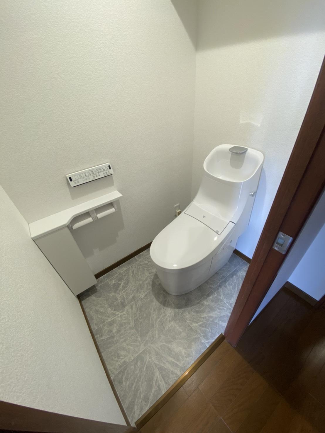トイレのお取替えと、クロス、CFシートの貼替を行いました。 紙巻器を収納付のタイプにしたことで ブラシなどの掃除用具をスッキリと収納できるようになりました。 天井には蓄光クロスを採用しました。癒し効果がありそうです。