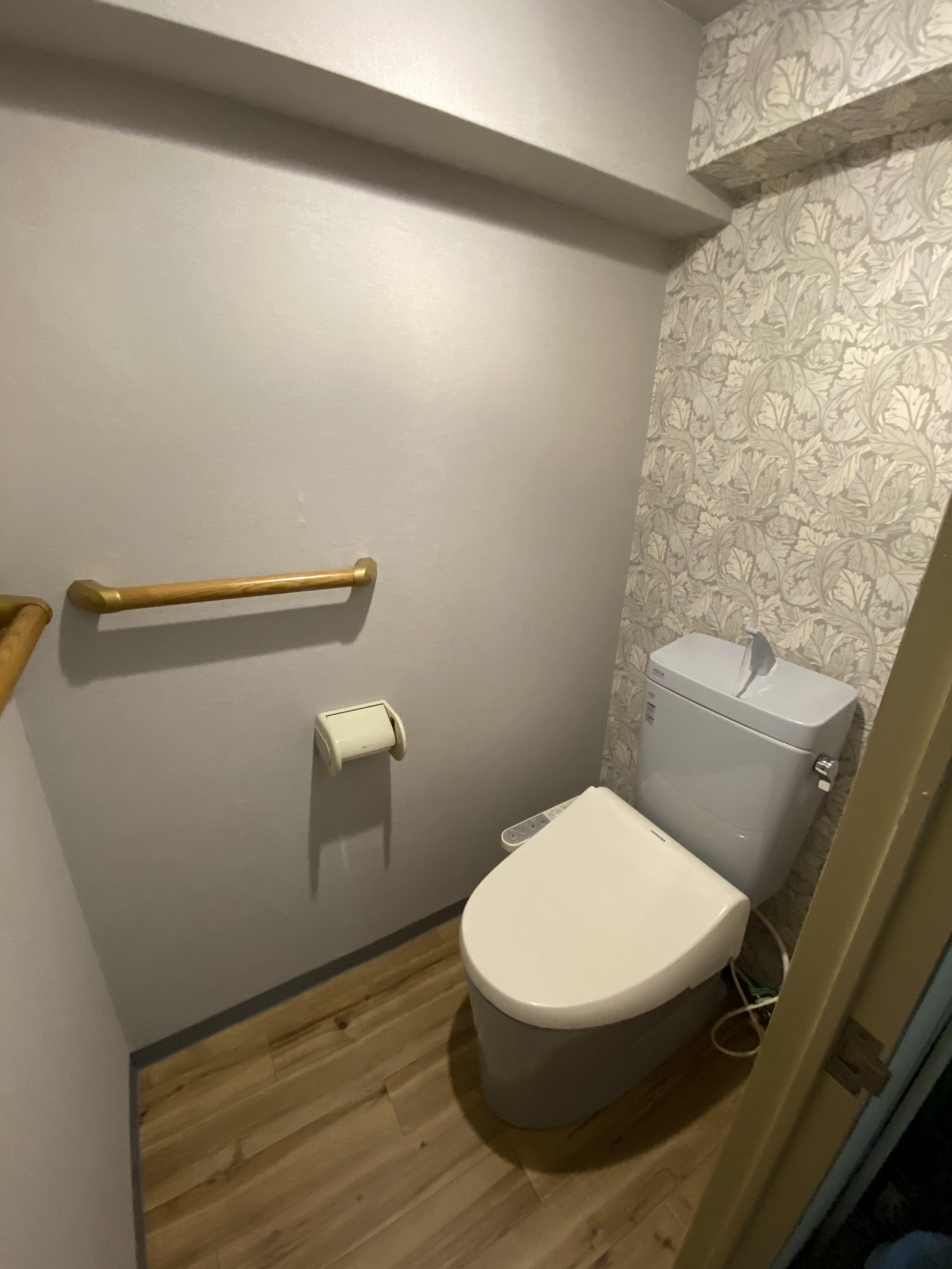 トイレの水漏れと壁紙の汚れが気になっていたことから、 リフォームのご依頼をいただきました。 便座は既存のままで、内装を便器を新しくしたいというお客様のご要望の元、グレーを基調とした落ち着いたトイレ空間になりました。