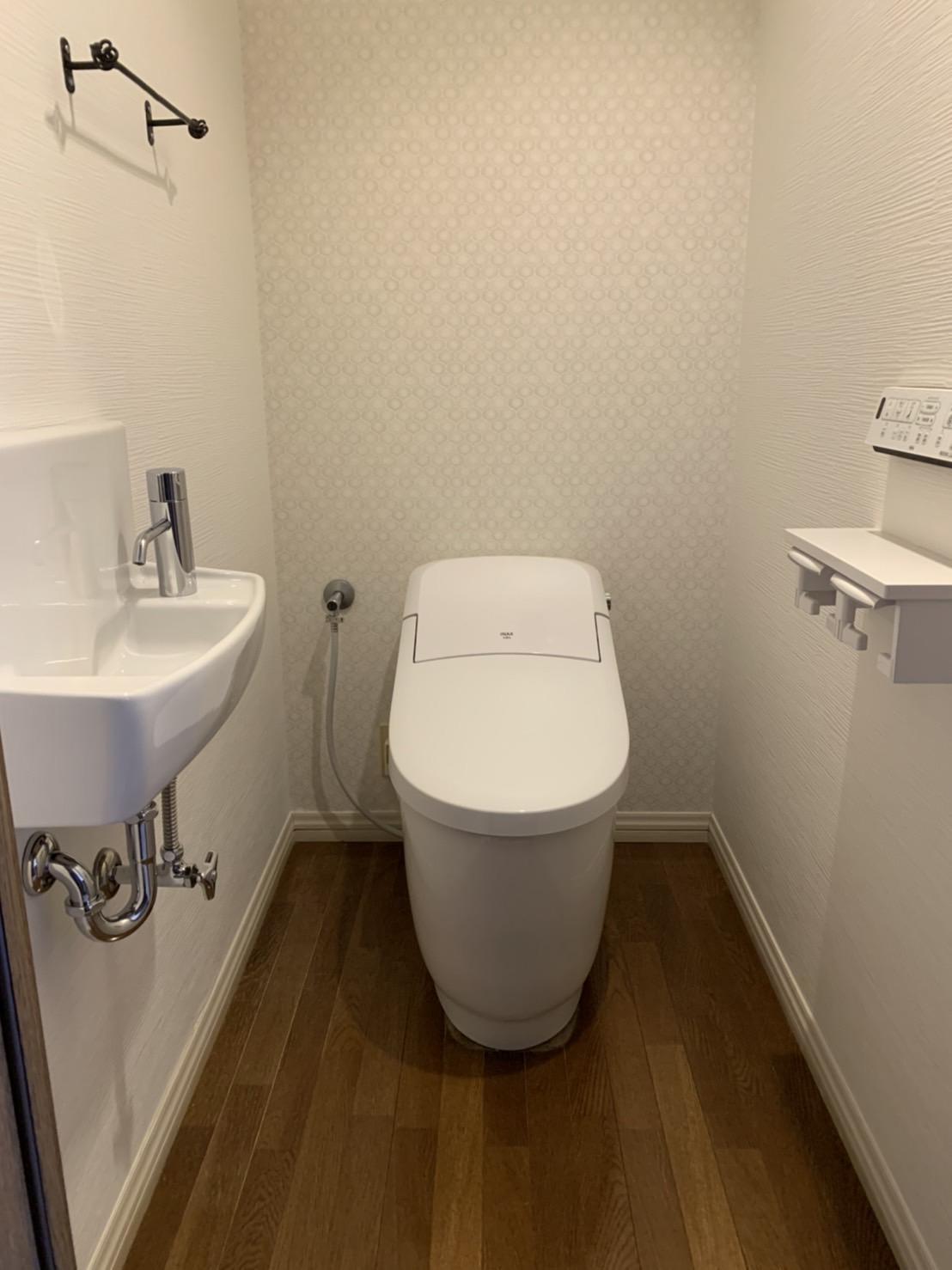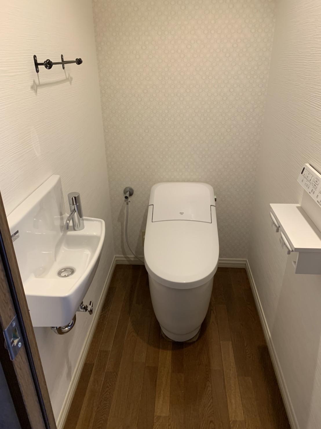 トイレのリフォームを行いました。 トイレ、手洗器のお取替えに加えて、クロスの貼替も行いました。 スッキリと清潔感のある空間になりました。