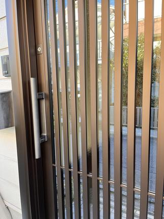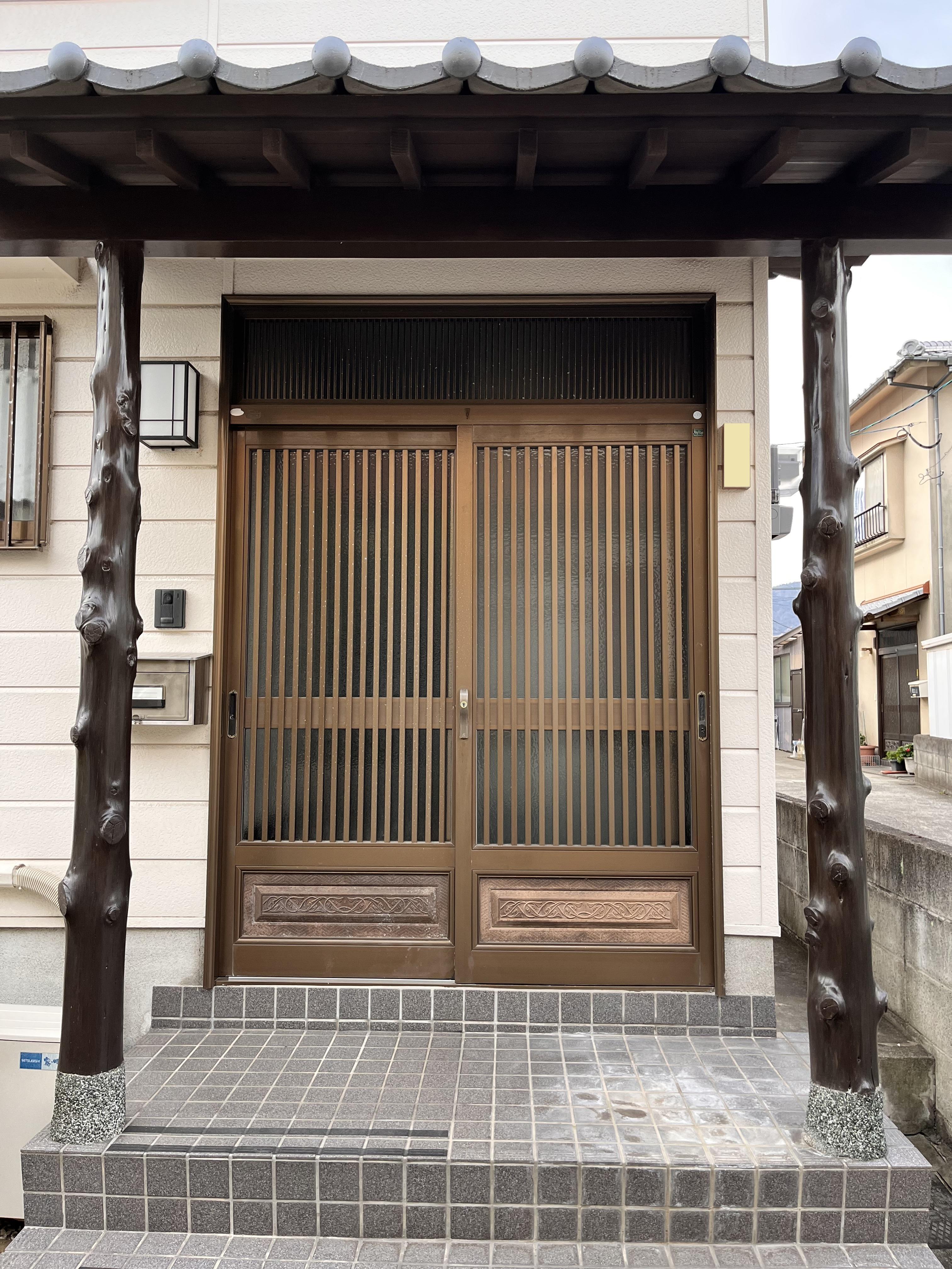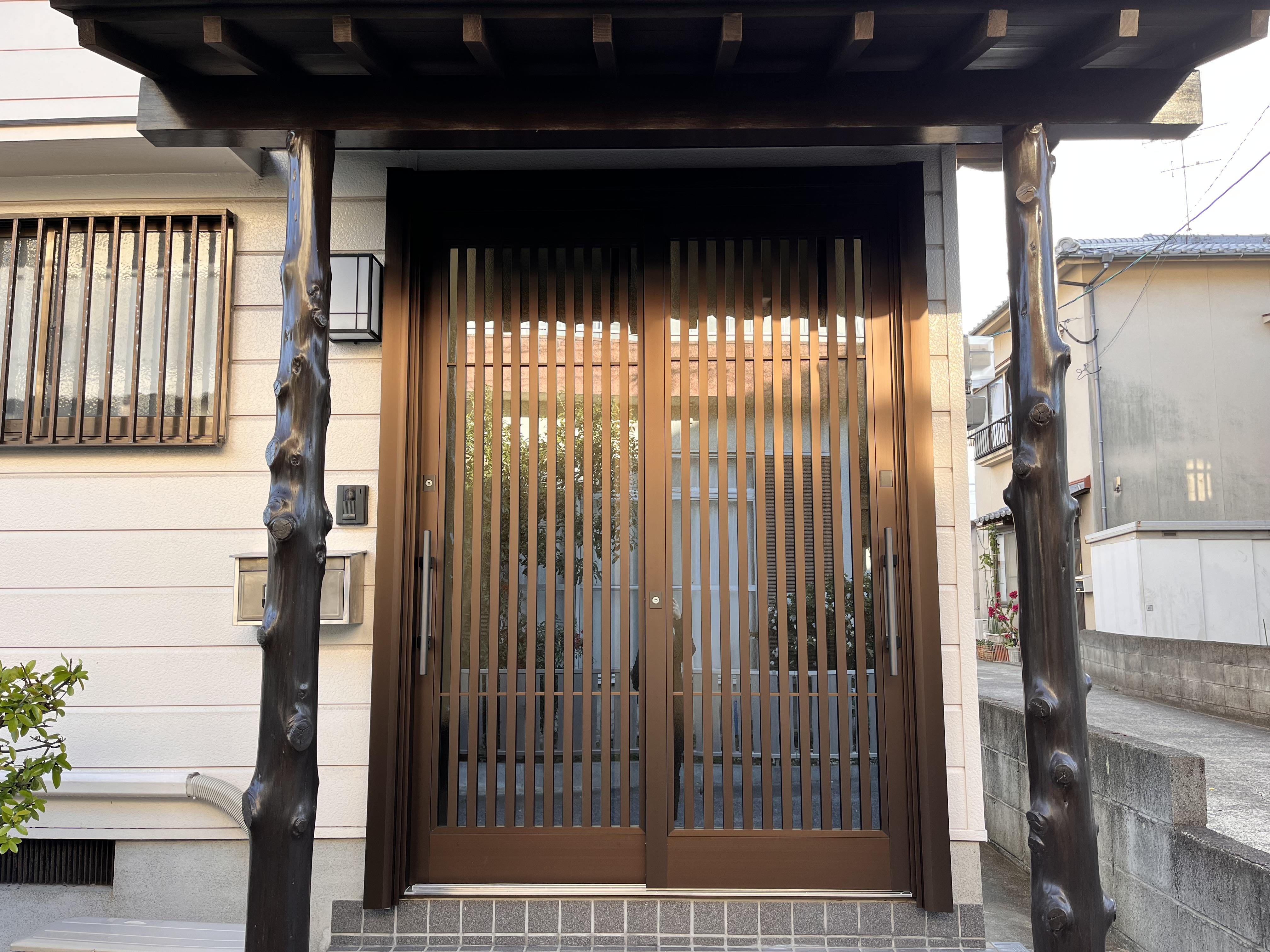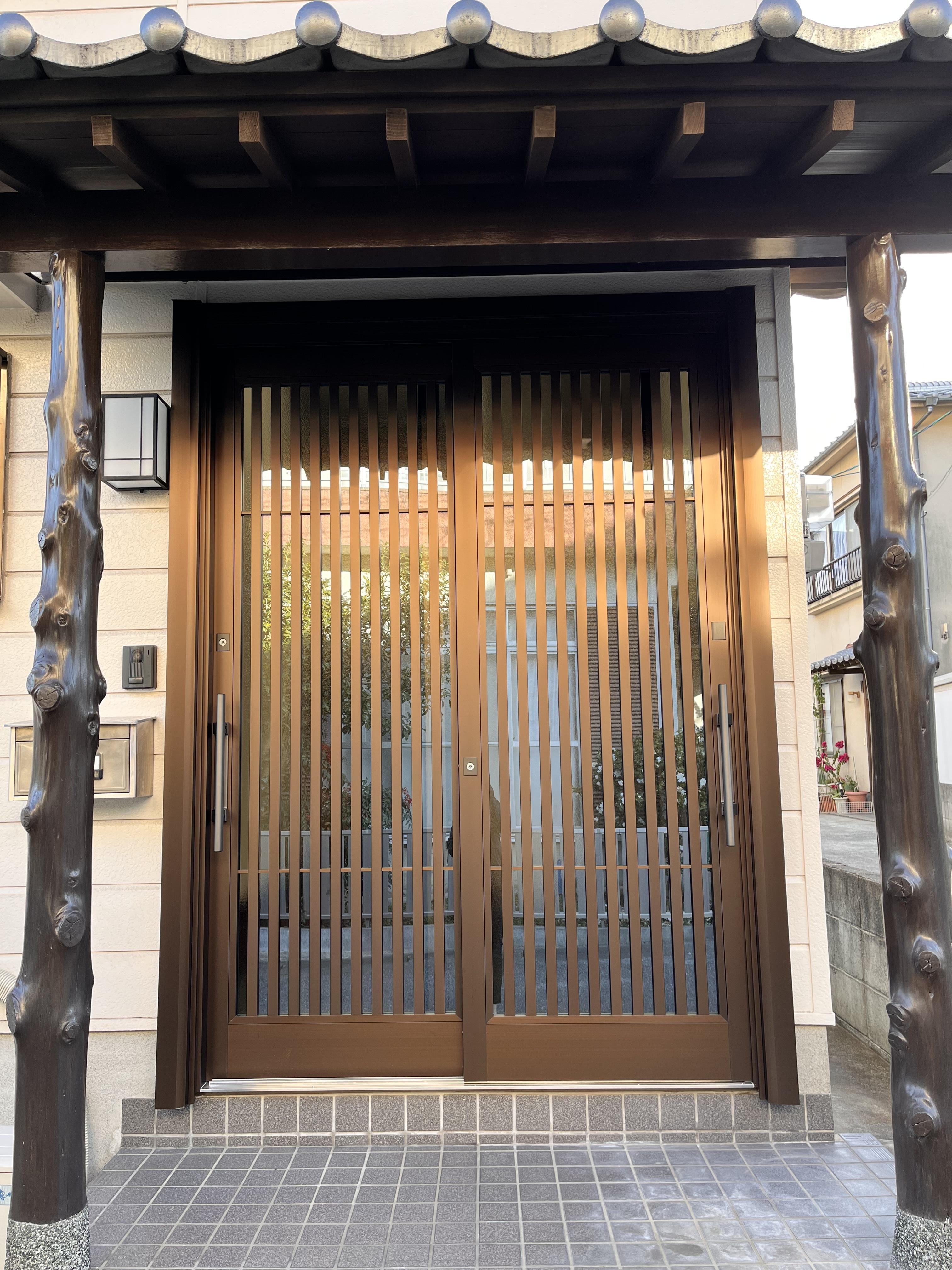 玄関ドアのリフォームをしました。 ご自宅の和の雰囲気に合うカラー、太桟格子のデザインを採用しました。 引手は開閉しやすいバーハンドルをお選びいただきました。