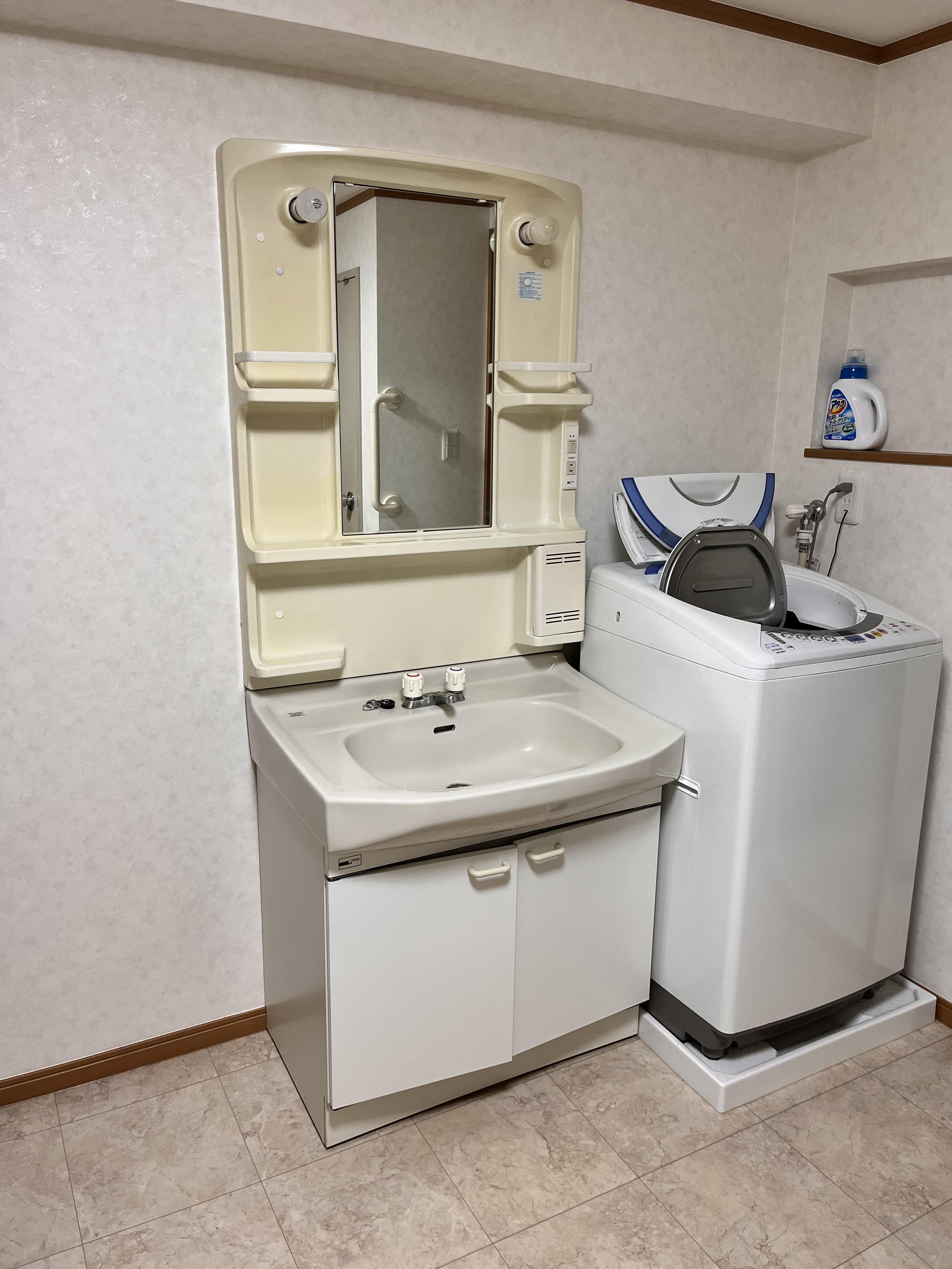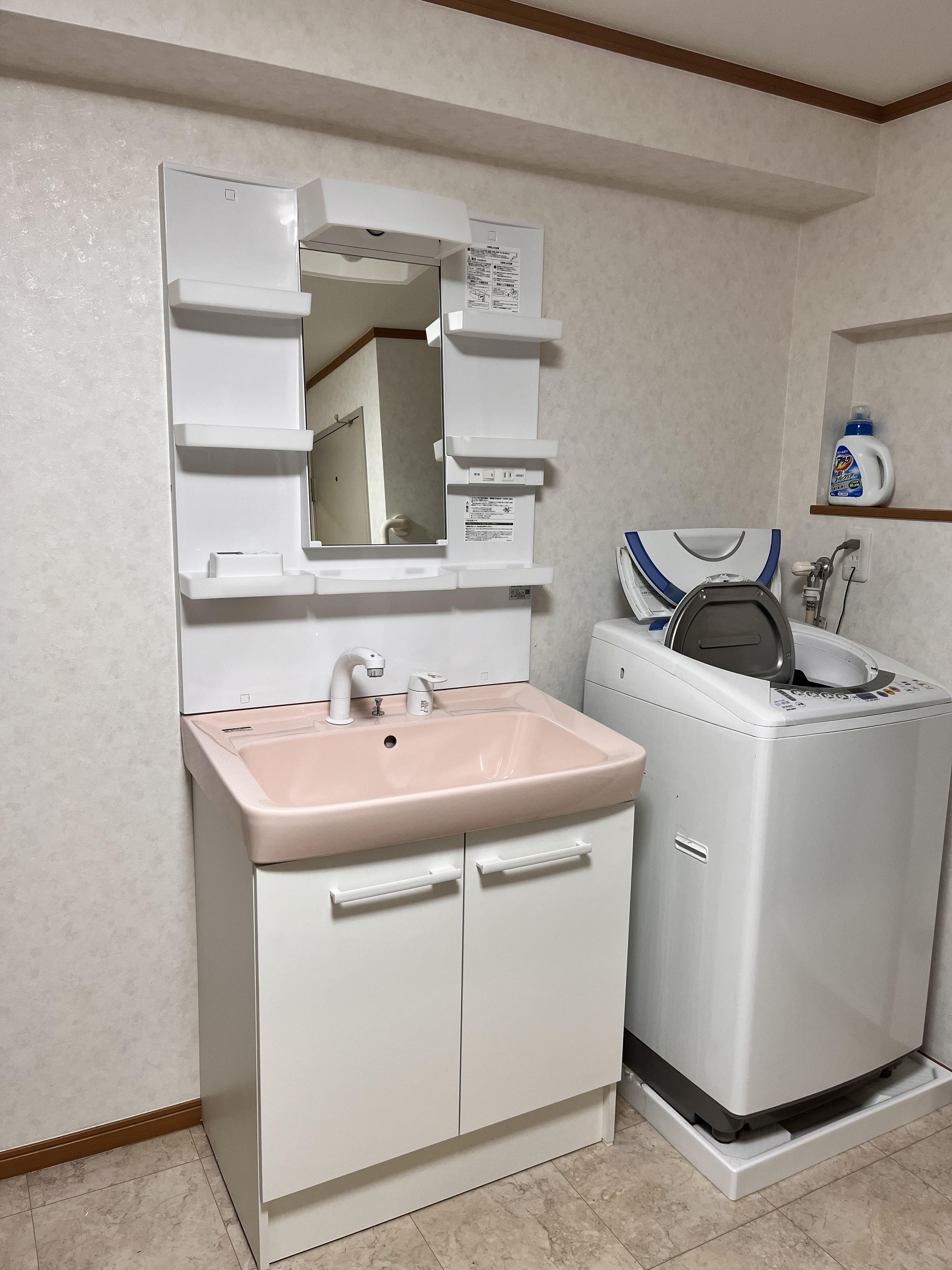 洗面化粧台をお取替えしました。 シンプルで使い勝手の良い洗面化粧台です。 ツーバルブタイプからサーモスタット混合水栓となったので、温度調整も楽々です。