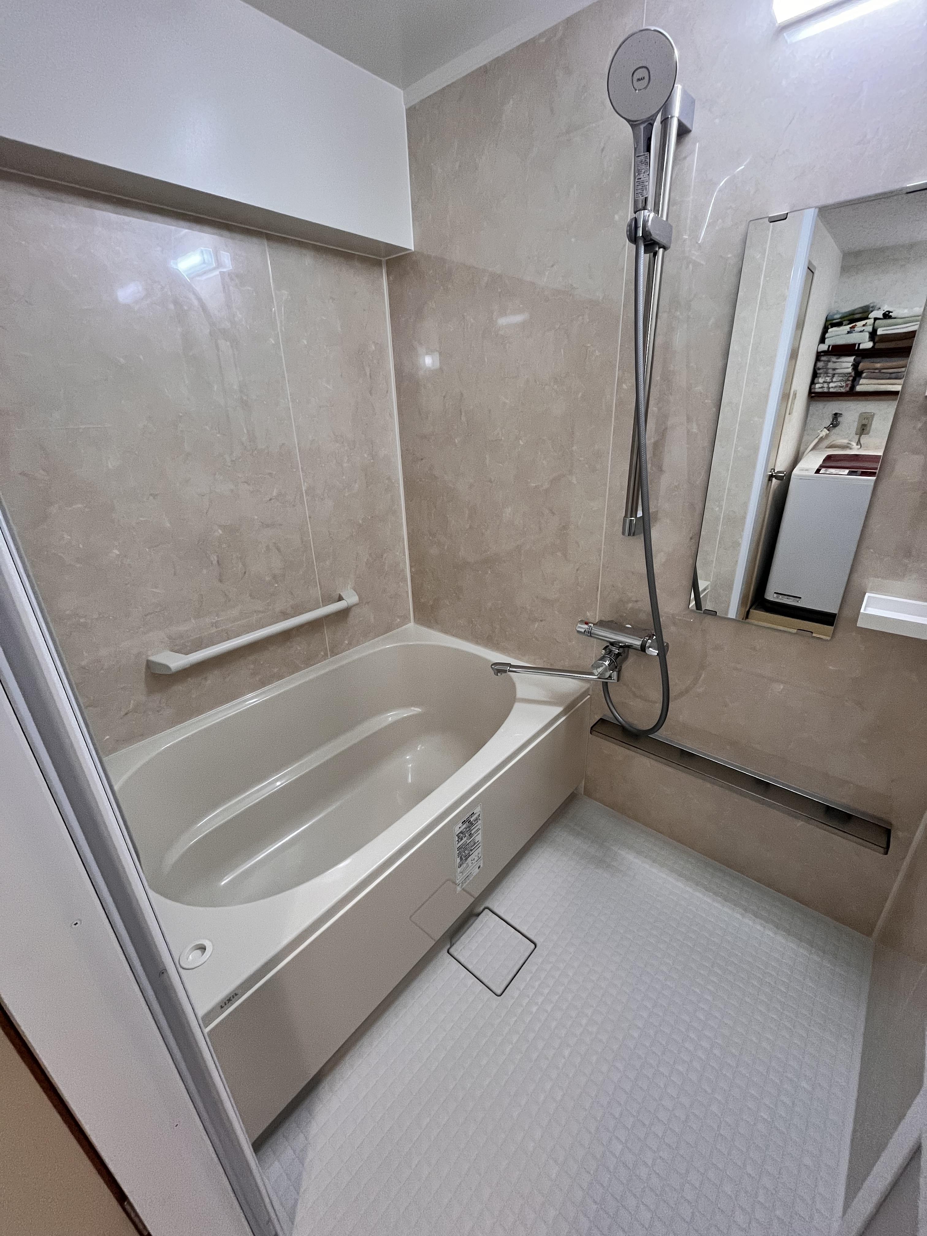 ユニットバスのリフォームを行いました。 今回お選びいただいたリノビオVには、カビの発生を抑制する効果がある「キレイサーモフロア」や、パッとくるりんポイ排水口など、綺麗が続き、お掃除もしやすい機能が沢山ついています。 癒しの浴室空間となりました。