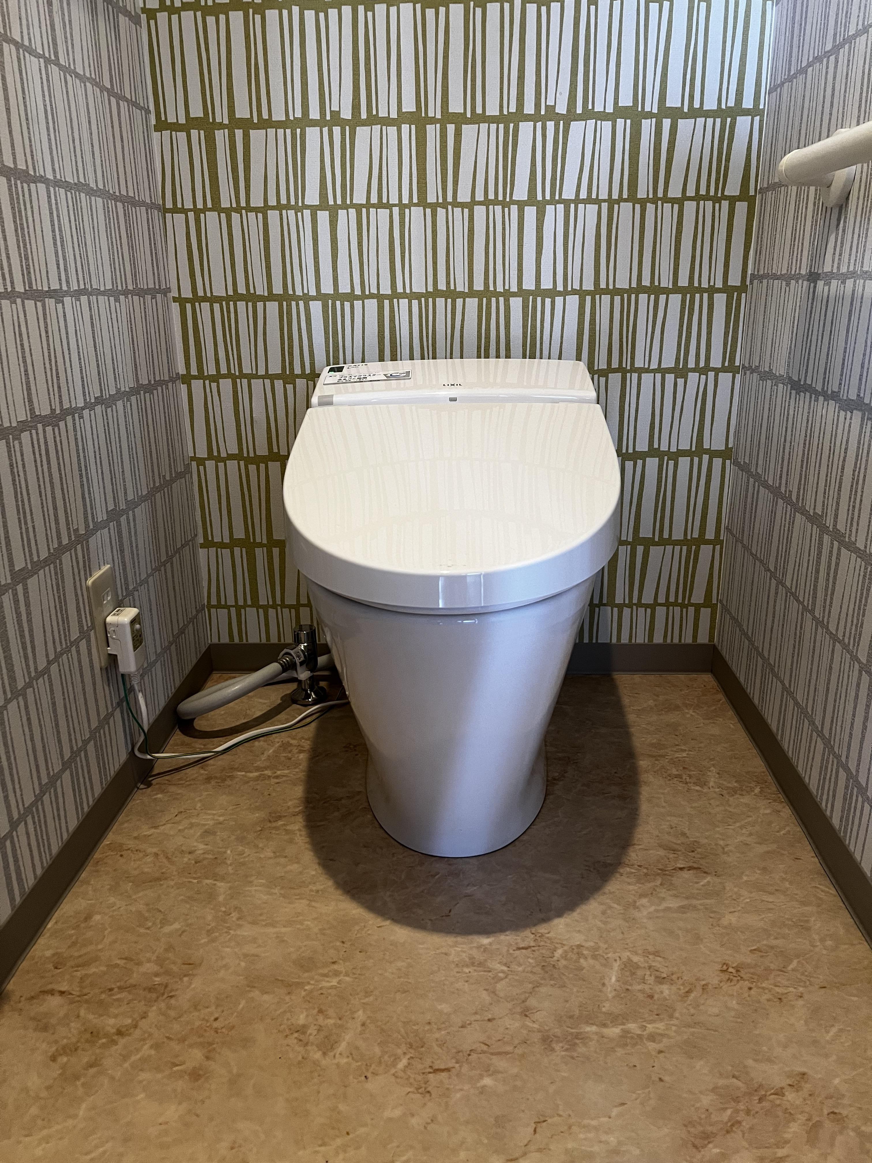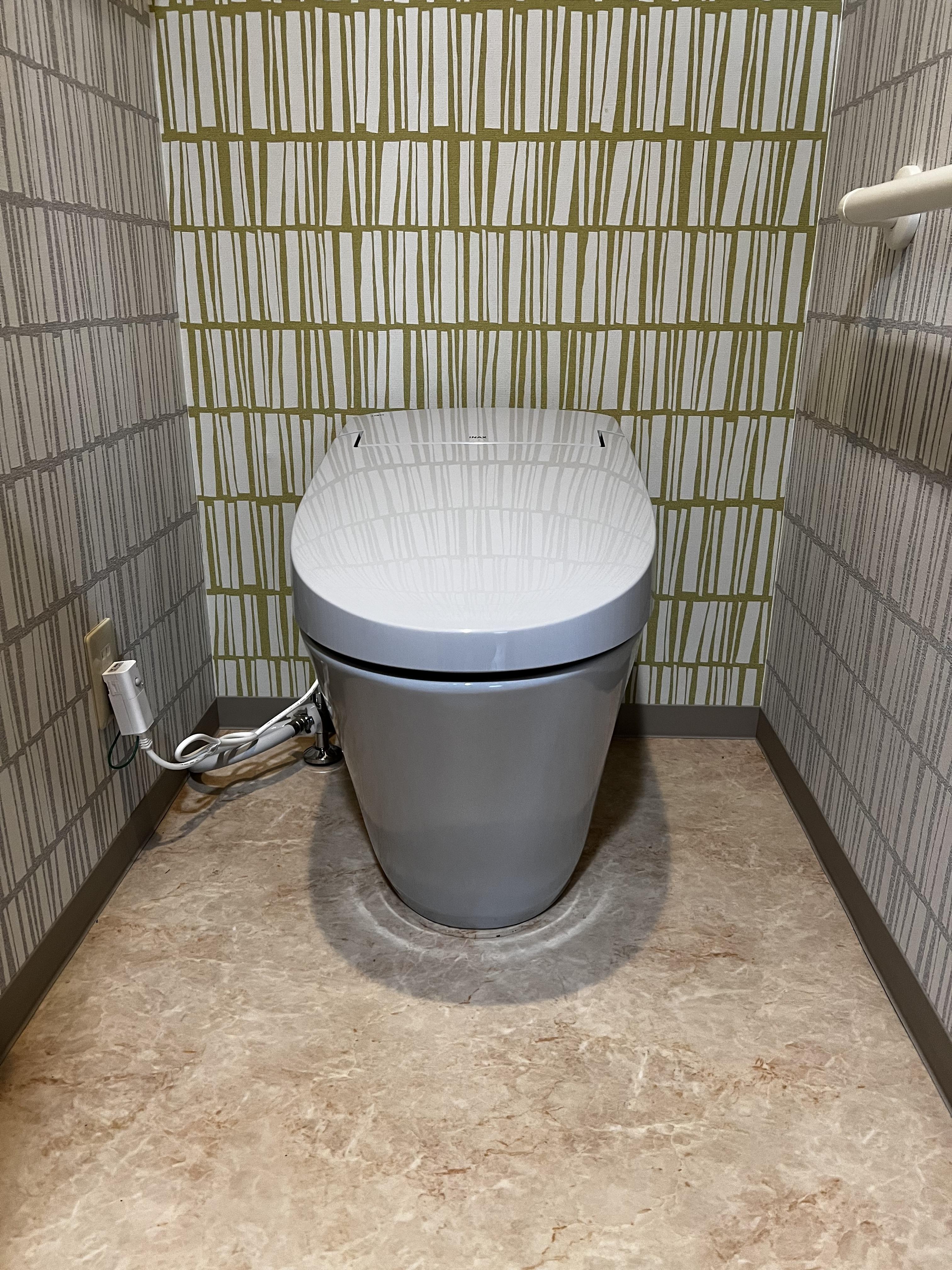 水漏れしたことがきっかけでトイレをお取替えしました。 空間の雰囲気は変えずに、今までご使用いただいていましたLIXIL製サティスSの最新モデルをお選びいただきました。 お色をブルーグレーにしました。
