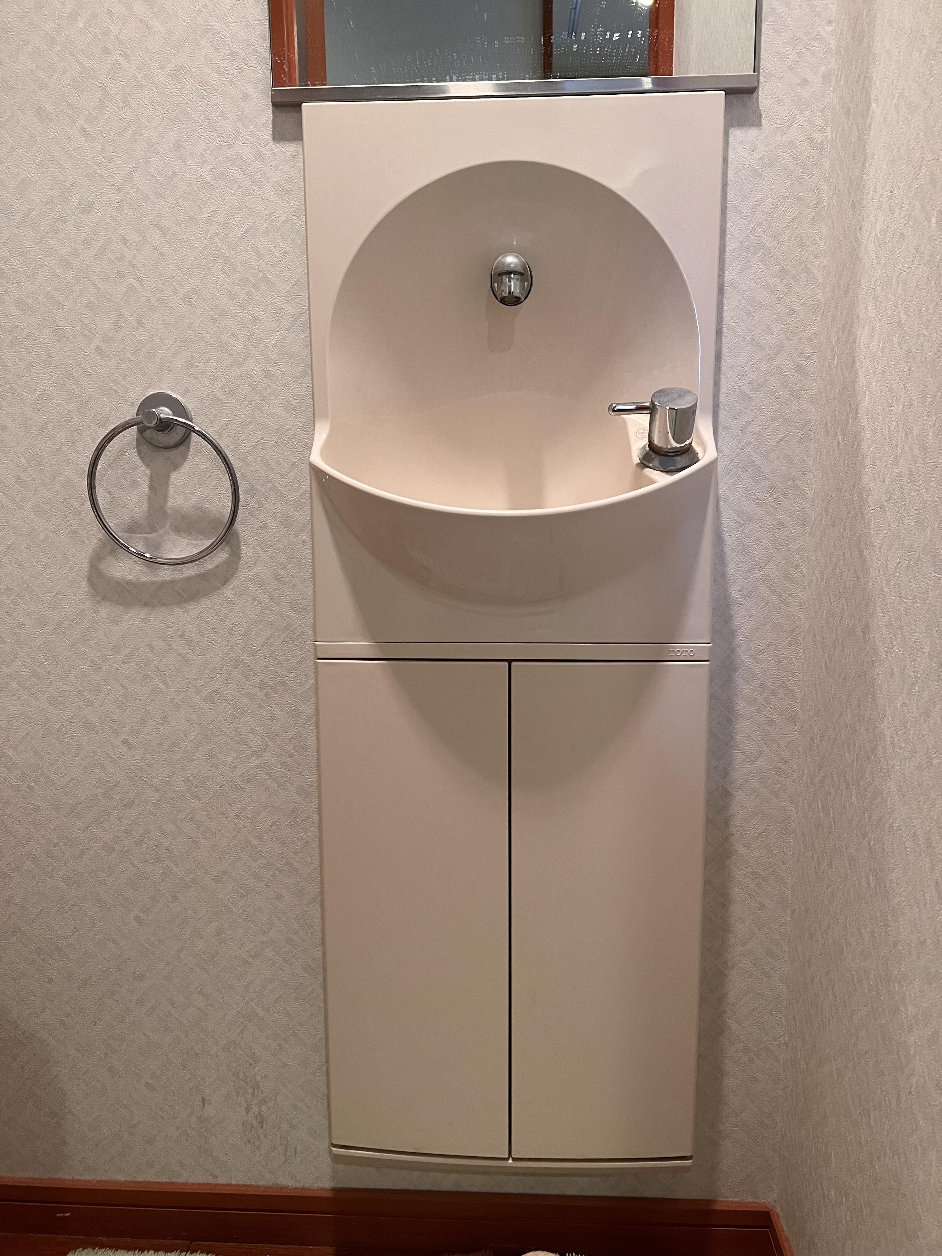 トイレの手洗い器のハンドルが固くなりご使用いただけない状況でしたが、こちらの手洗器はハンドルのみの交換ができないため、手洗器ごと交換しました。ハンドルが軽くなり快適にご使用いただけるようになりました。 (参考工事価格 約6万円)