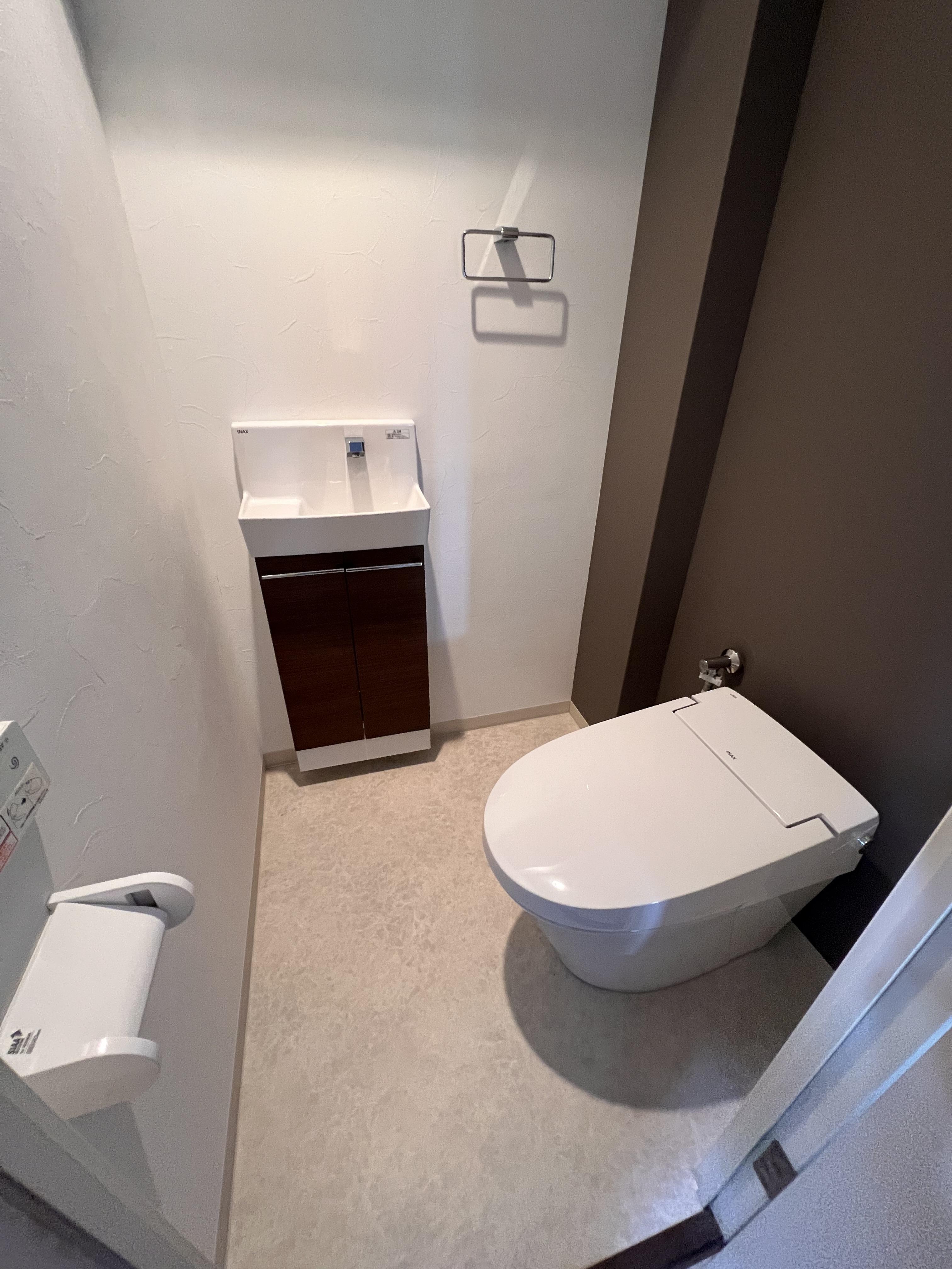 トイレのリフォームを行いました。 トイレが狭いので、コンパクトトイレを採用しました。 手洗器も自動水栓にして掃除用具を収納できるタイプにしました。 (参考工事価格 約45万円)