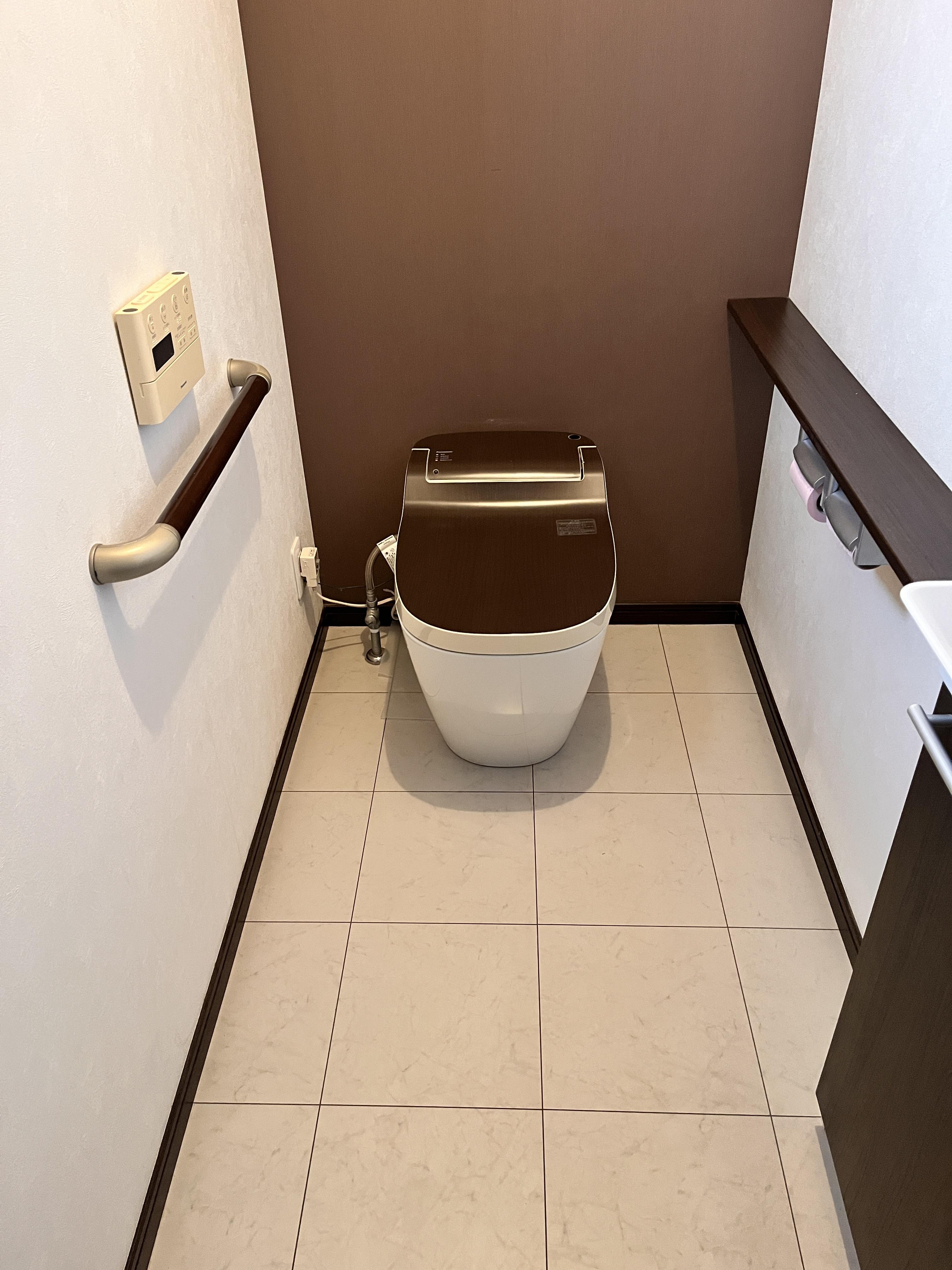 トイレリフォームを行いました。 今回のリフォームにあたり、最上級グレードのサティスGをお選びいただきました。 サティスGは優美なフォルムとゆったりとした座り心地が特徴的です。