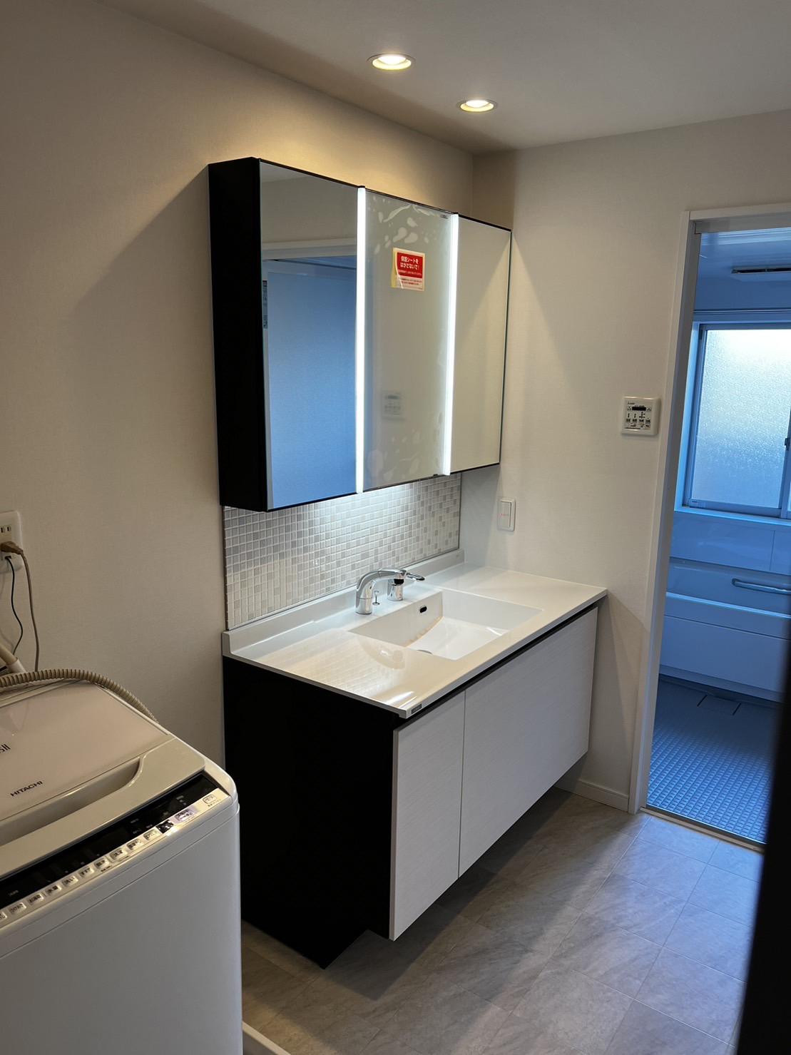 洗面所をリフォームしました。 今回採用したのは、高級感がありまるでホテルのようなシリーズ『ルミシス』 人造大理石の深みのある質感と鏡面仕上げの透明感を持つ上質なボウルデザイン、 更に左右からの光で顔に影を作りにくいフェイスフルライトが特徴です。 クロスとCFシートも貼り替えました。 (参考工事価格 約70万円)