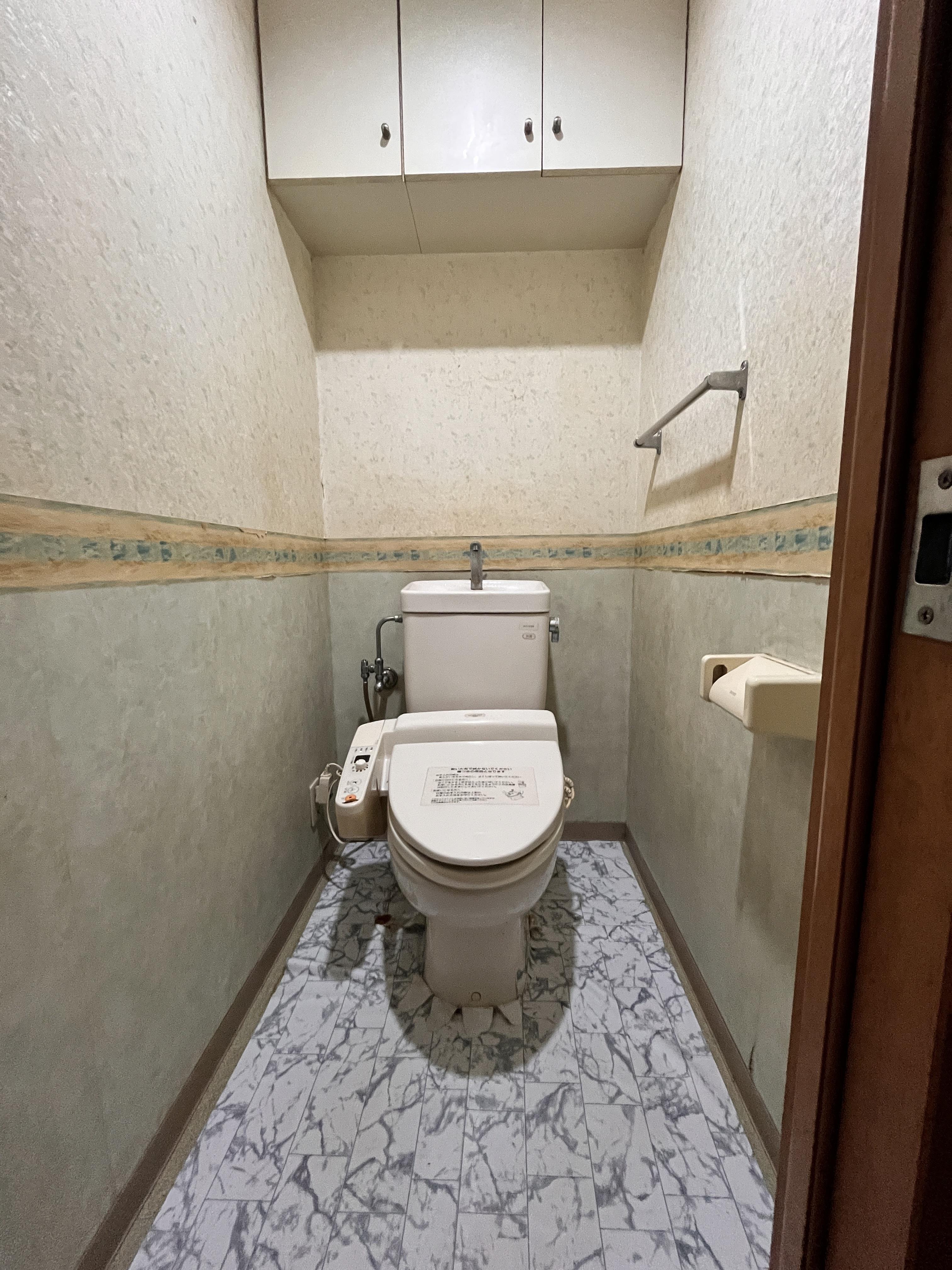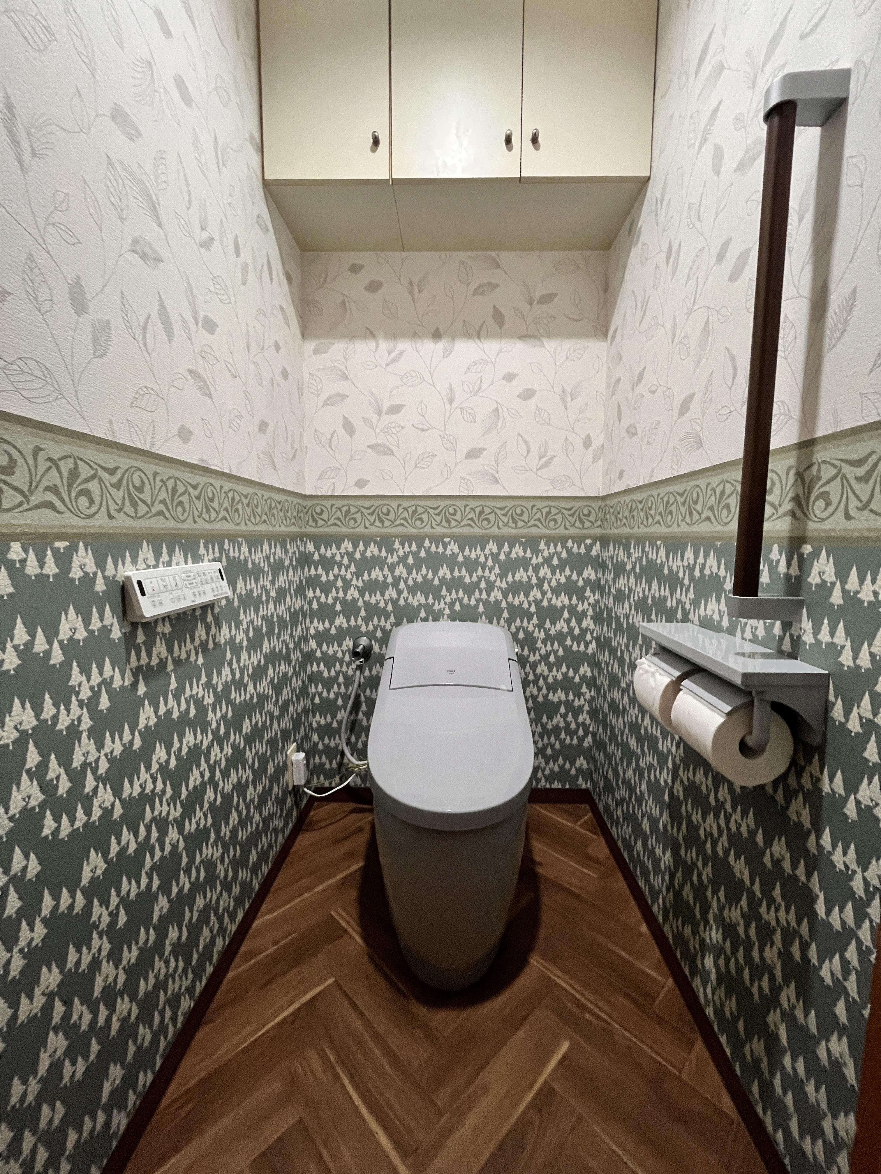 トイレをお取替えしました。 合わせてクロスとCFシートの貼替も行いました。 壁のクロスを上下で貼り分けました。 トリム(帯)とクロスの色柄がマッチした、かわいいトイレ空間になりました。 (参考工事価格 約35~40万円)
