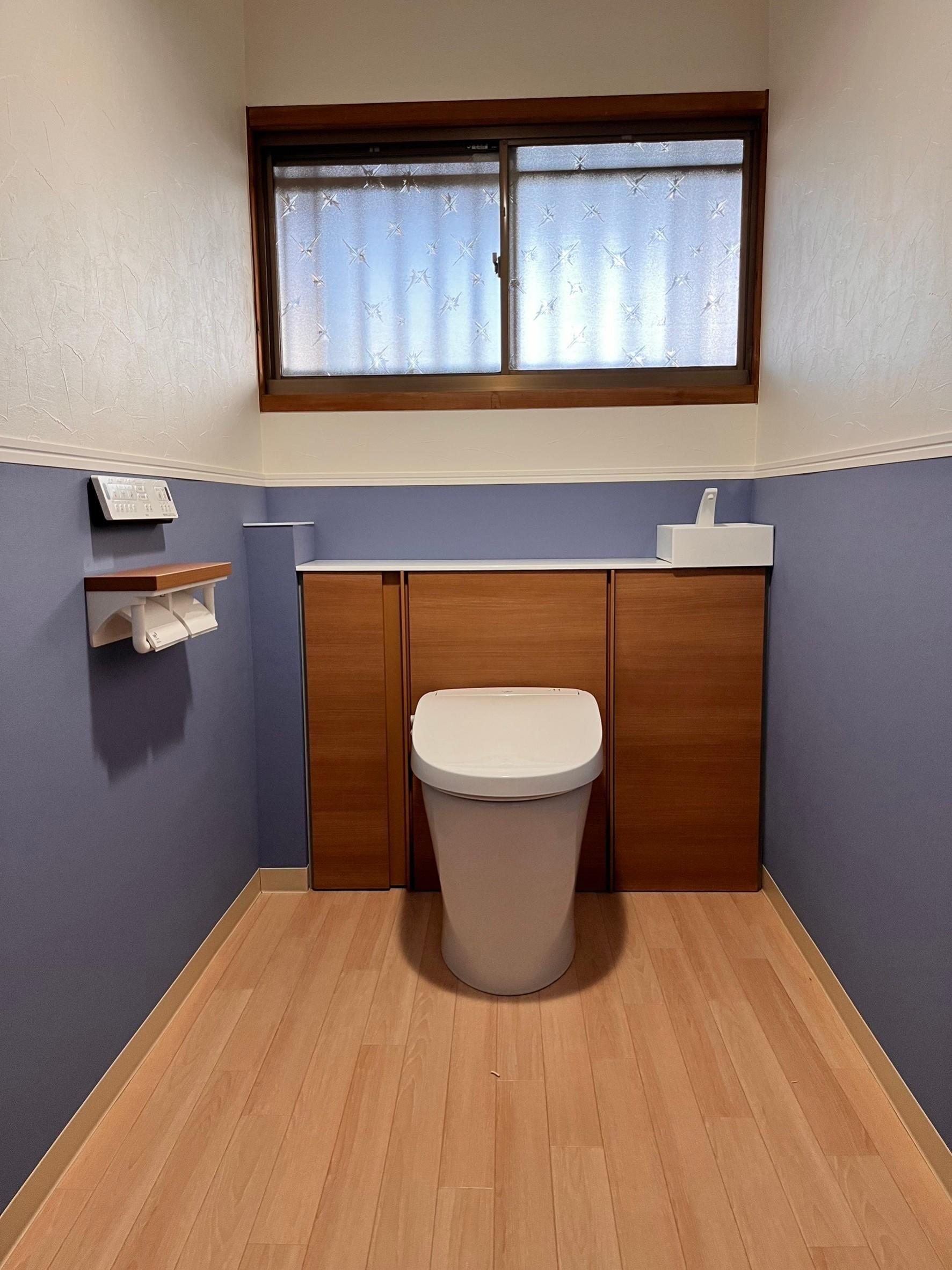 更に壁のクロスを上下で貼り分けたことで爽やかでお洒落なトイレ空間になりました。