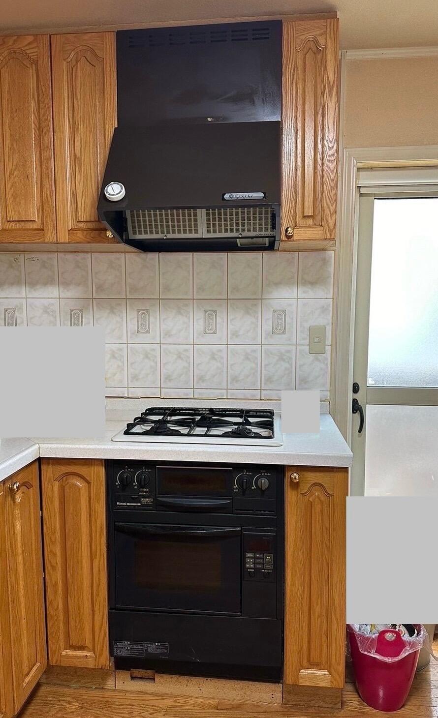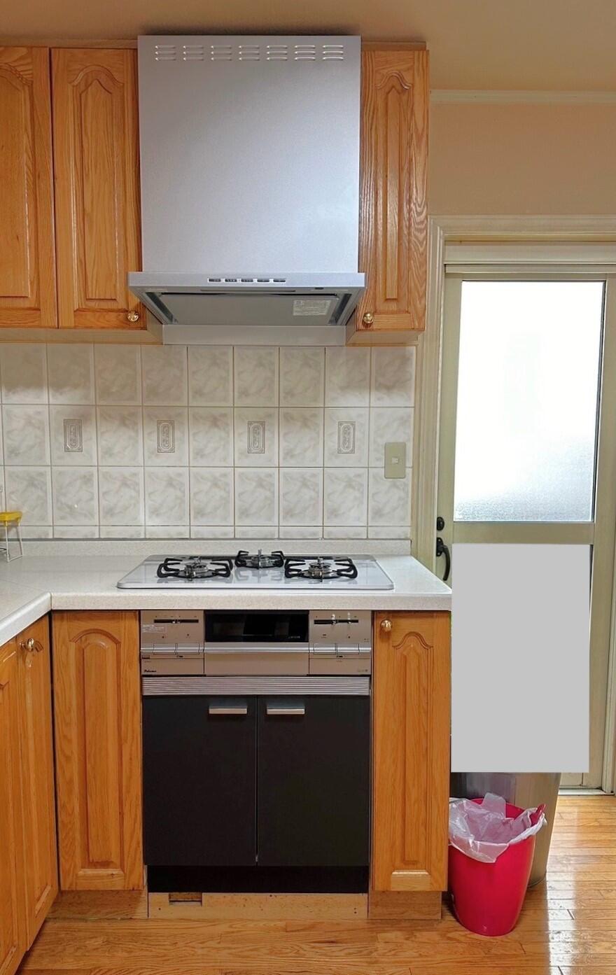 今回のリフォームのきっかけは、キッチンのレンジフードが作動しなくなったことと、ガスコンロも古い為、交換をご希望。コンロ下のビルトインオーブンもほとんど使わない為、撤去して収納にすることにしました。