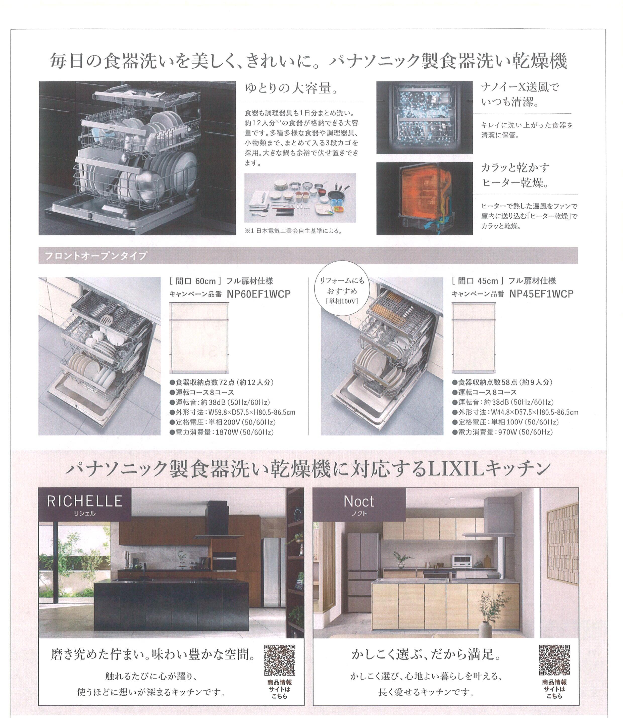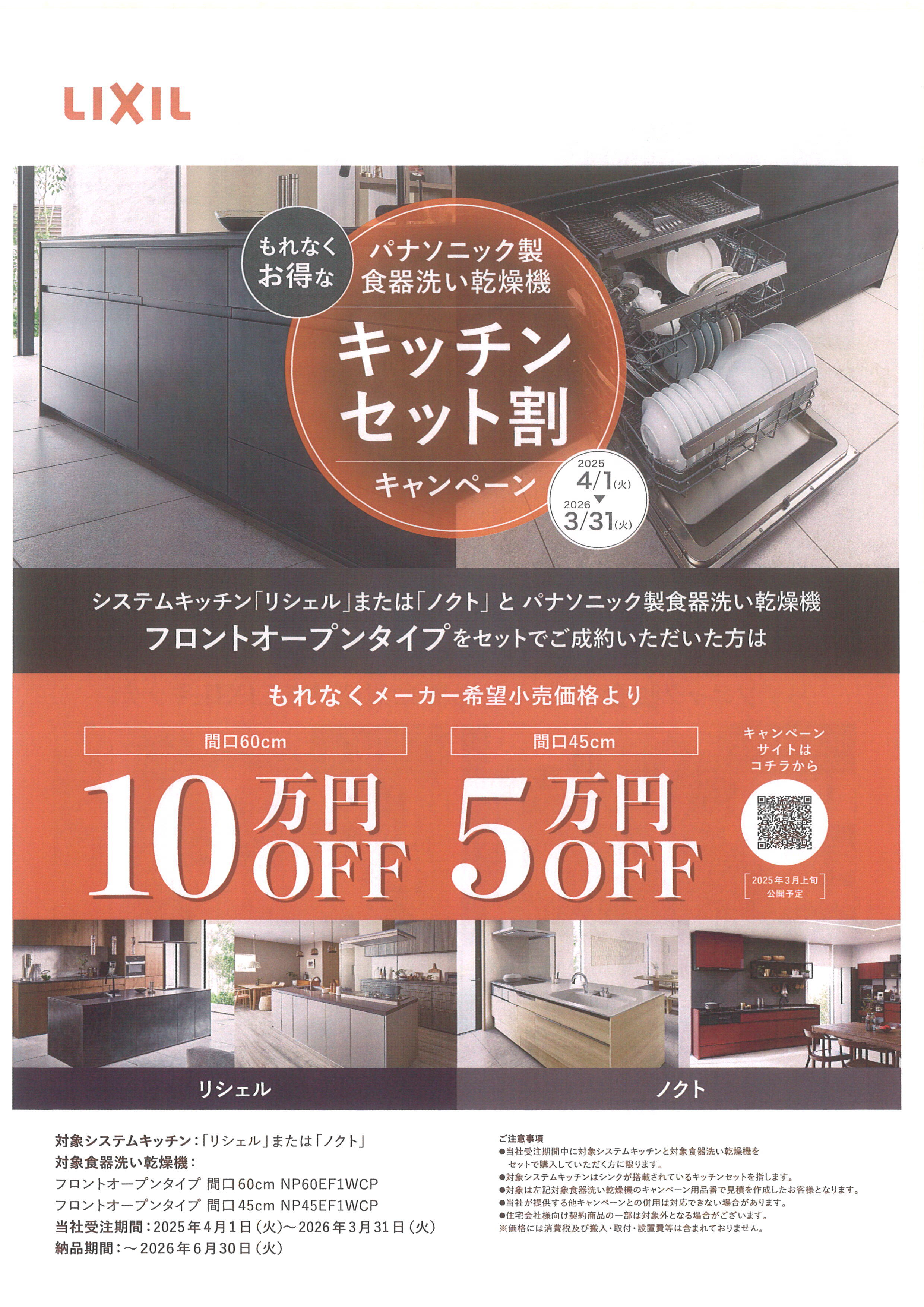 対象のシステムキッチン(リシェル/ノクト)+ パナソニック製食器洗い乾燥機(フロントオープンタイプ)を セットでご成約の方は、もれなく最大10万円OFF!