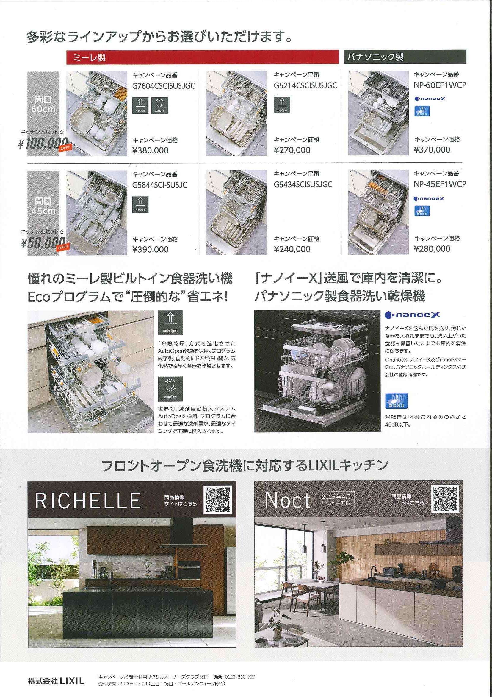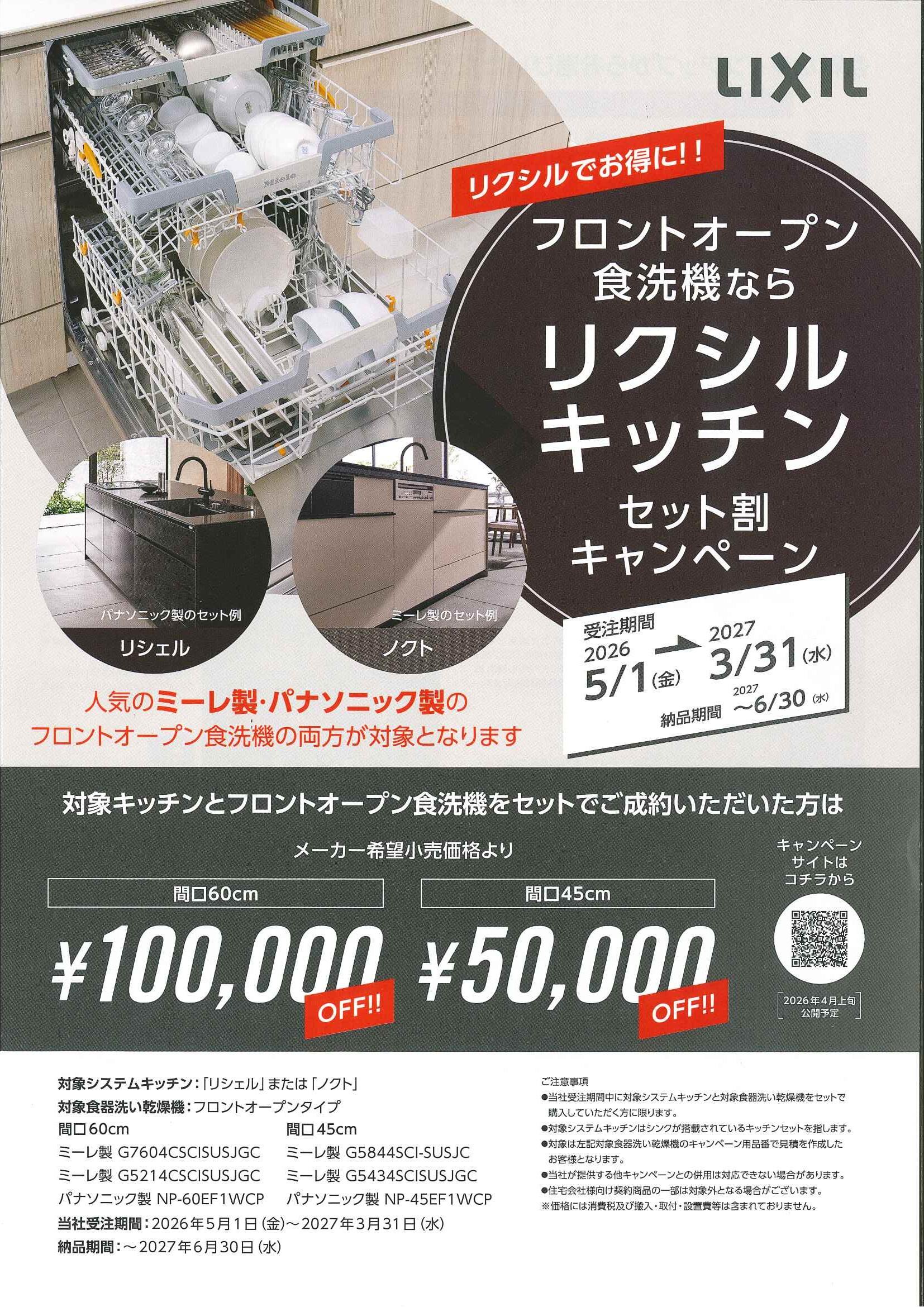 対象のLIXILシステムキッチン(リシェル/ノクト)とフロントオープン食洗機をセットでご成約いただくと、