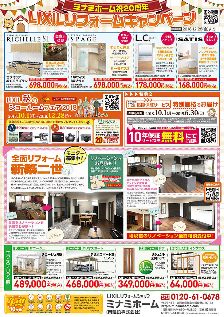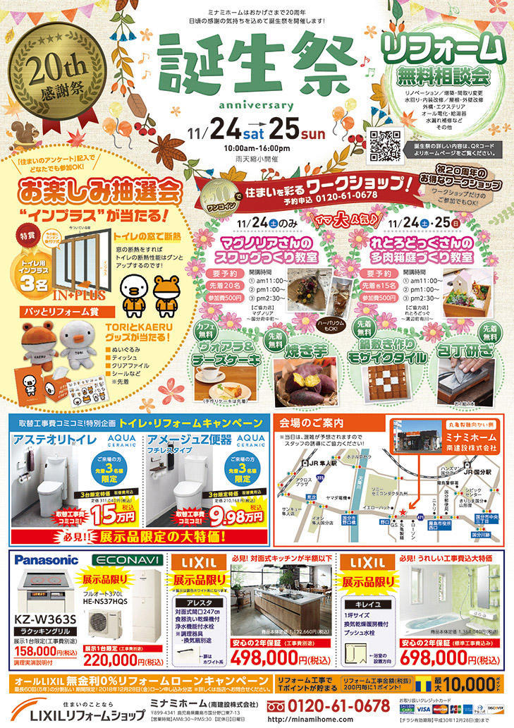ミナミホームはおかげさまで20周年!! 日頃の感謝の気持ちを込めて誕生祭を開催します! リフォーム無料相談会を行いますので、リノベーションや増築、水回りや内装・外壁の改修など、気になるリフォームについてお気軽にご相談ください!! また、いま大人気のワークショップや、アンケートのご記入で参加できるお楽しみ抽選会など楽しい催し物盛りだくさん♪この機会をお見逃しなく!! 詳細は下記チラシをご覧ください。みなさまのご来場を心よりお待ちしております。