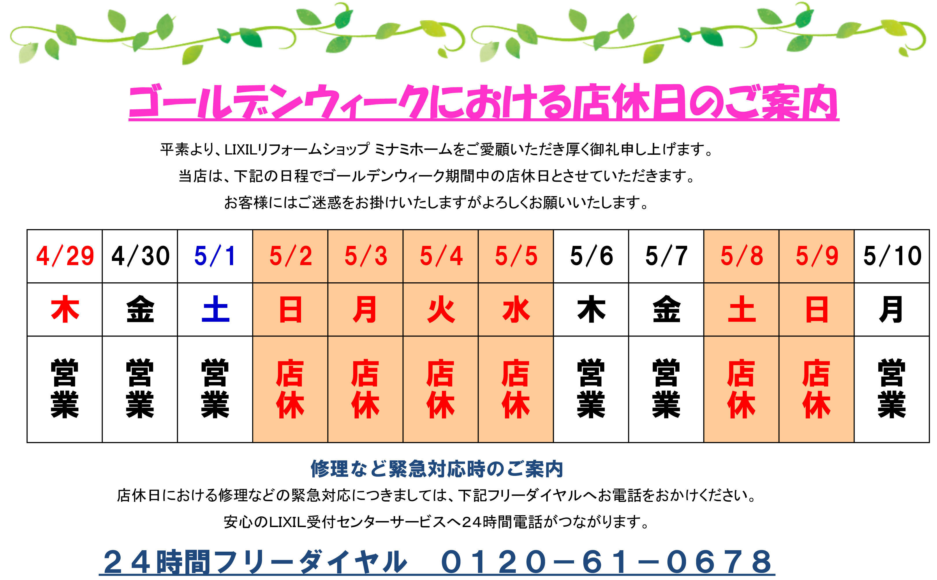 平素より、LIXILリフォームショップ ミナミホームをご愛顧いただき厚くお礼し上げます。当店では、年末年始期間中を下記日程で店休日とさせて頂きます。ご迷惑をお掛けいたしますが宜しくお願い致します。