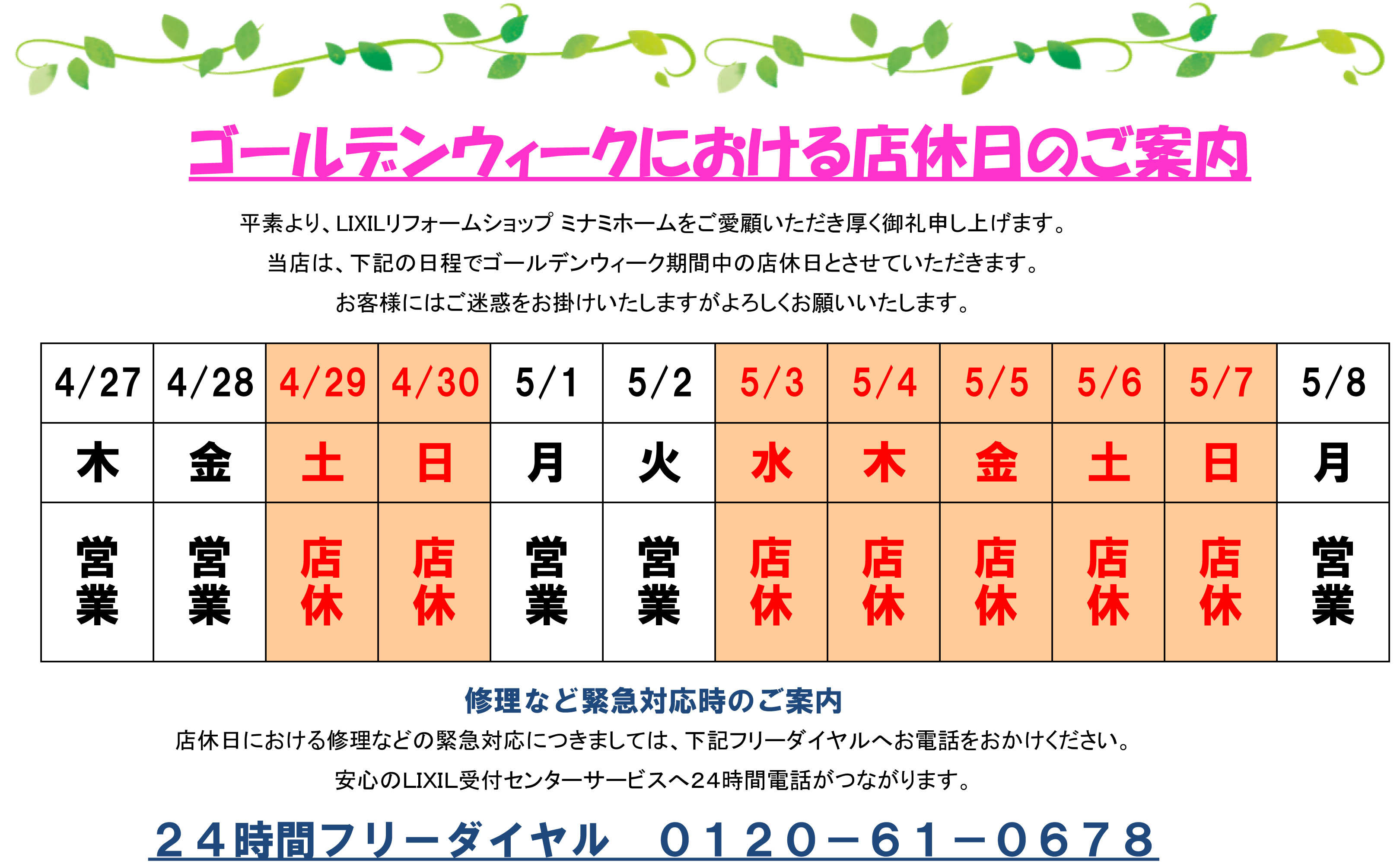 平素より、LIXILリフォームショップ ミナミホームをご愛顧いただき厚くお礼し上げます。当店では、ゴールデンウイーク期間中を下記日程で店休日とさせて頂きます。ご迷惑をお掛けいたしますが宜しくお願い致します。