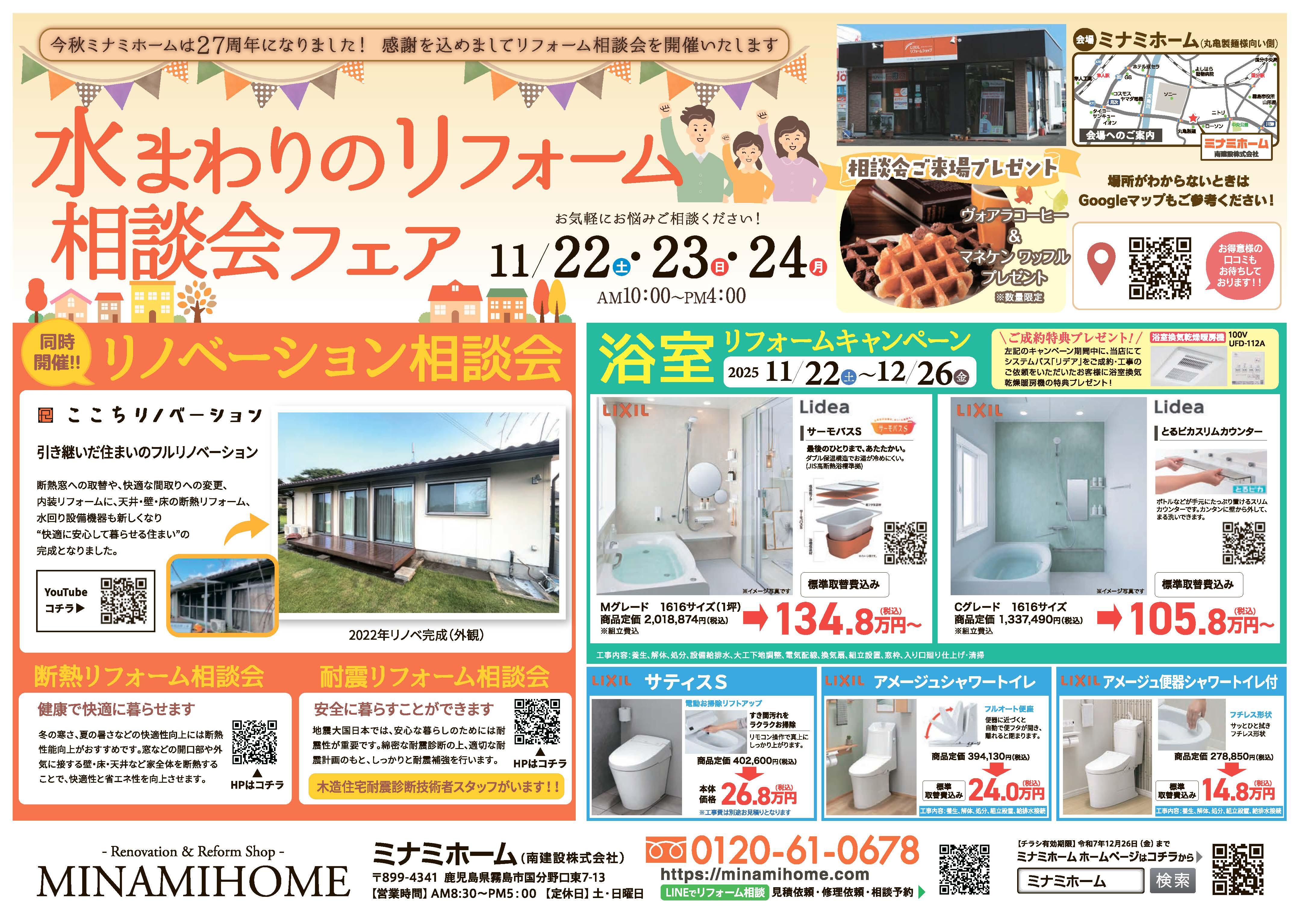 感謝を込めまして、11月22日(土)~24日(月)に「水まわりのリフォーム相談会フェア」を開催いたします(^^)/