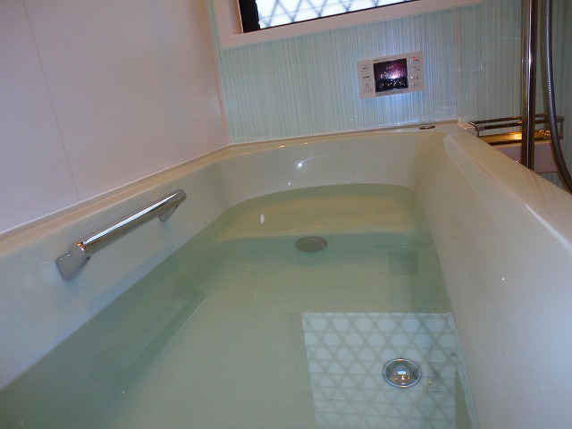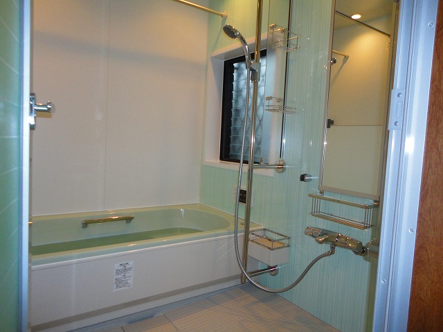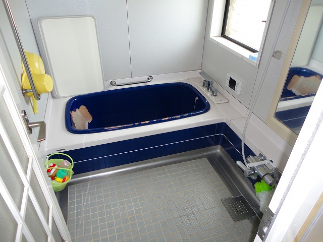 浴室の改修工事を行いました。浴槽の色がはがれていましたが、綺麗なシステムバスに取り替えました。収納棚も、しっかりと水を切ってくれて衛生的です。