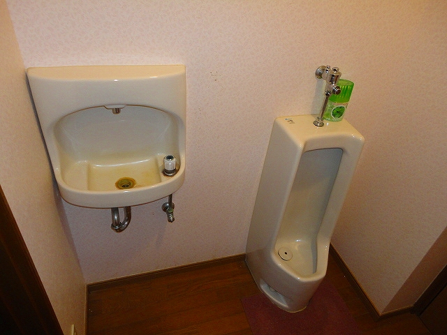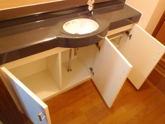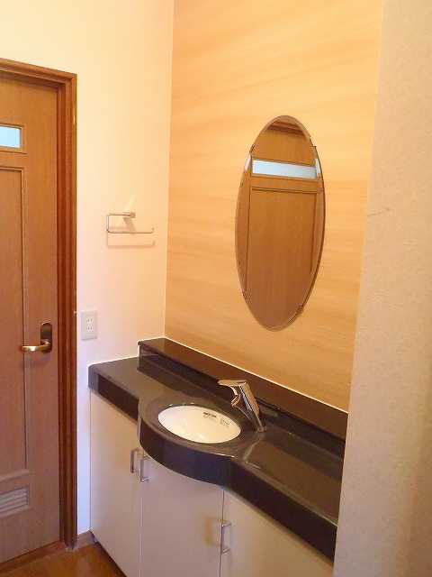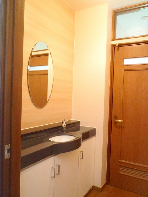 丸い鏡にカウンター式のトイレ手洗い。高級感あふれる素敵な空間に大変身しました。