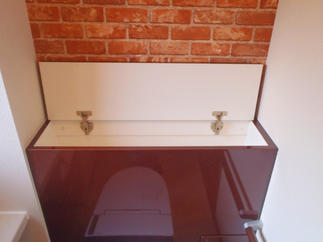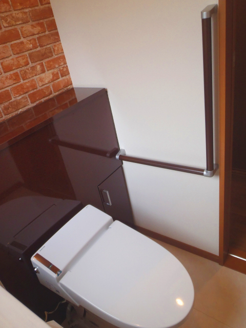 トイレをサティスにしました。後ろのレンガ柄の壁がとてもおしゃれなトイレになりました。