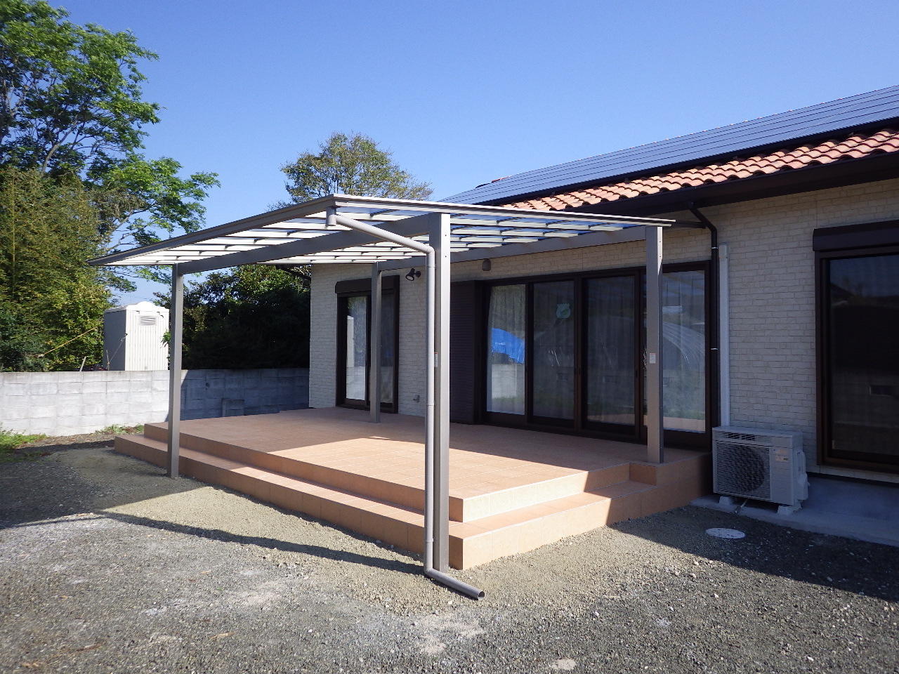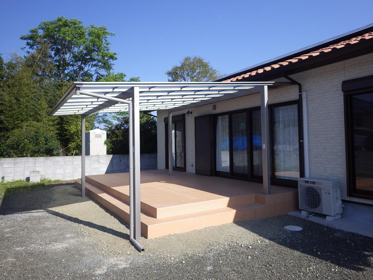 広いお庭におしゃれなタイルのデッキテラスが出来上がりました。外で過ごす時間が楽しくなりそうです。