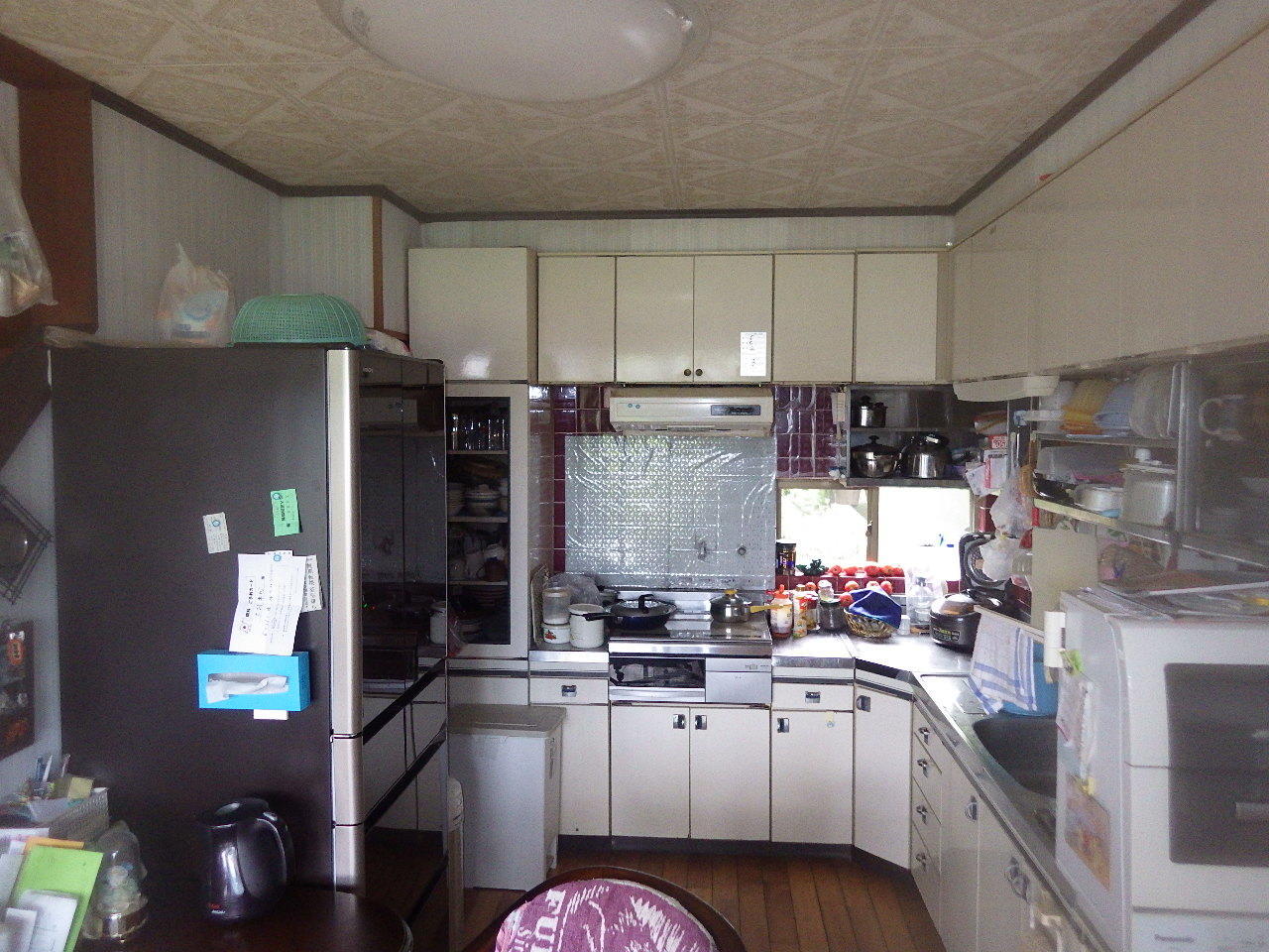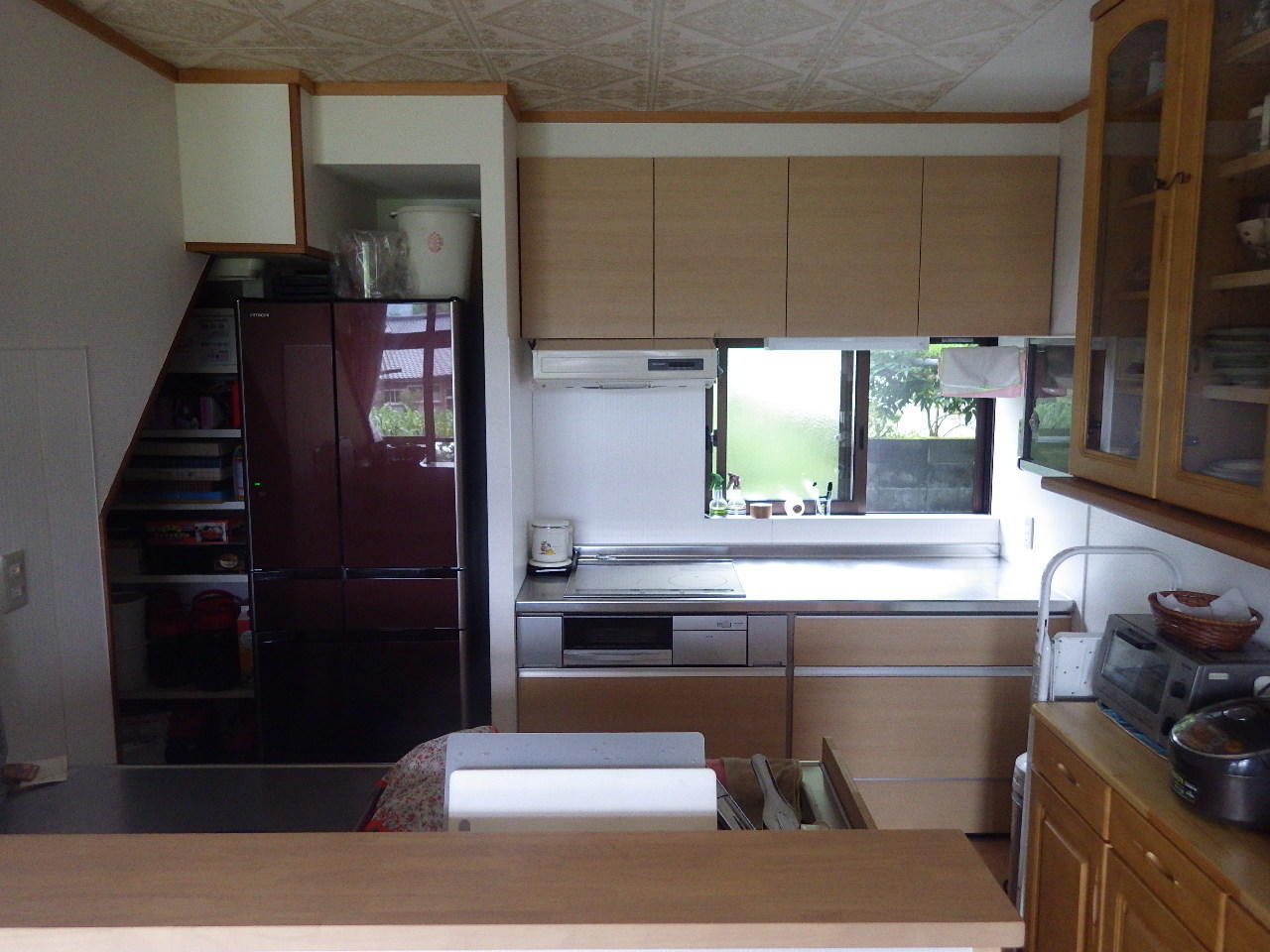今まで食器が入っていた棚のところに、冷蔵庫を置くスペースを作ることで大きな冷蔵庫もスッキリと納まりました。また、L字型キッチンを流し台とコンロを分けて設置し、流し台の前にはカウンターを造作したので、見た目もよりスッキリし導線の確保もできました。