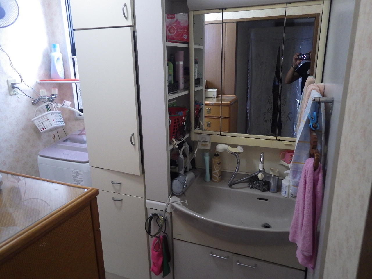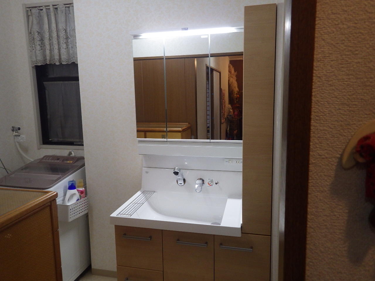 きれいに収納されていた以前の棚でしたが、入口から丸見えなのがちょっと気になるところでした。また部屋の真ん中に棚があるため行き来がしづらい点も・・・壁側に収納棚を持ってきたことで、見た目も動線もスッキリ統一感のある洗面脱衣室になりました。