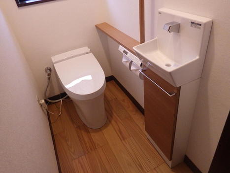 タンクレストイレ、サティスをご採用のリフォームです。 タンク付きトイレよりも奥行き寸法が短いタンクレストイレにしたことでできたスペースに、掃除用具などを収納できる手洗い器を付けました。それでもスペースはゆったりです。 クロスと床も張り替えて、まるで新築のようなトイレ空間になりました。