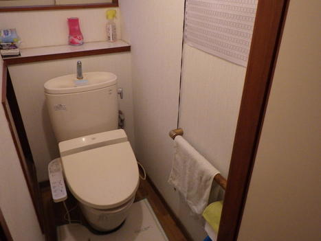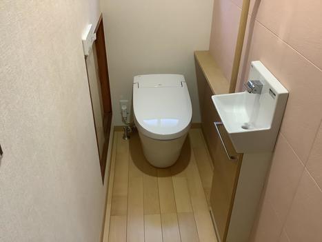 タンク付きのトイレからタンクレストイレへ。 トイレを広く使えるようになりました。 お客様は湿気を気にされていたので、アクセントをかねて壁のひとつの面にエコカラットを貼り、オシャレで機能的なトイレ空間に仕上がりました。