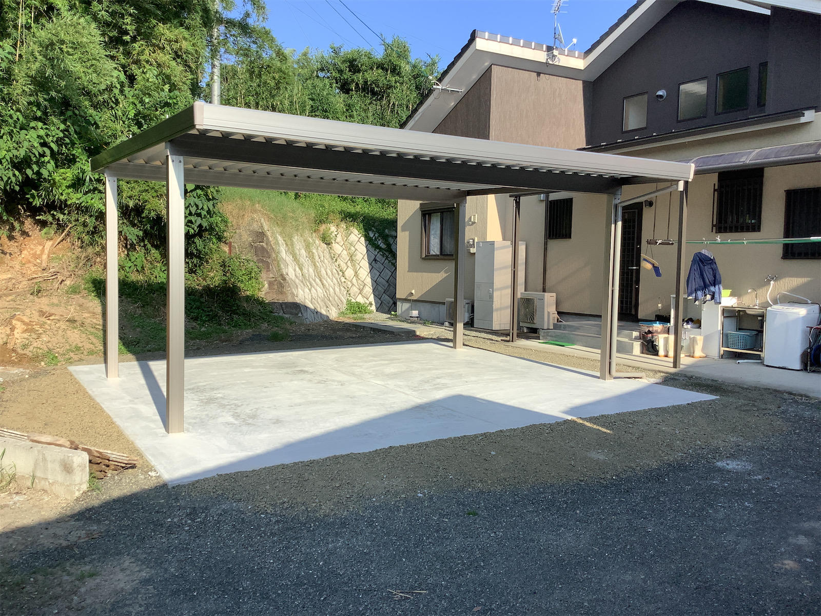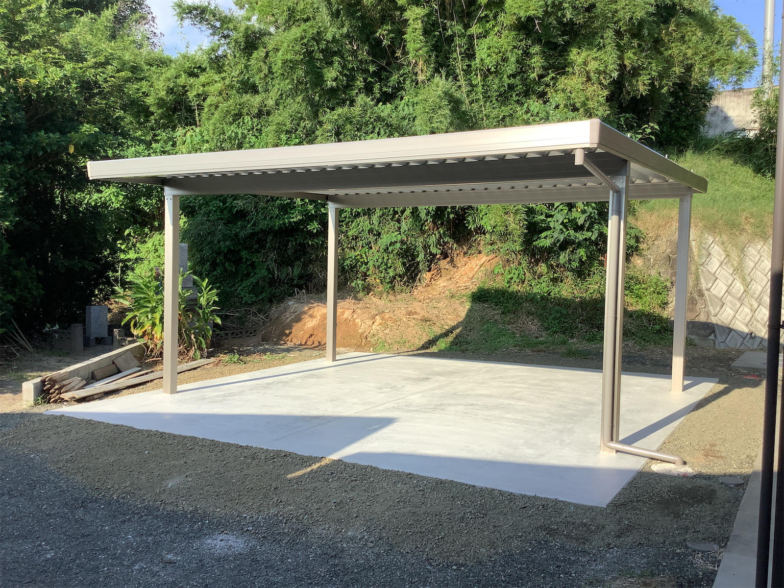 2台用のカーポートを設置しました。(LIXIL/カーポートSW) 住宅外観になじむシンプルなデザイン、台風や強風に耐え抜く強さをコンセプトとしたカーポートです。 (耐風圧強度46m/秒相当)
