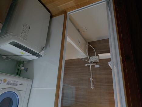 洗面台と洗濯機・乾燥機を置いた洗面脱衣室は浴室への出入口を狭めていましたが、洗面脱衣室を広くして横並びにすることで、出入りがスムーズに。