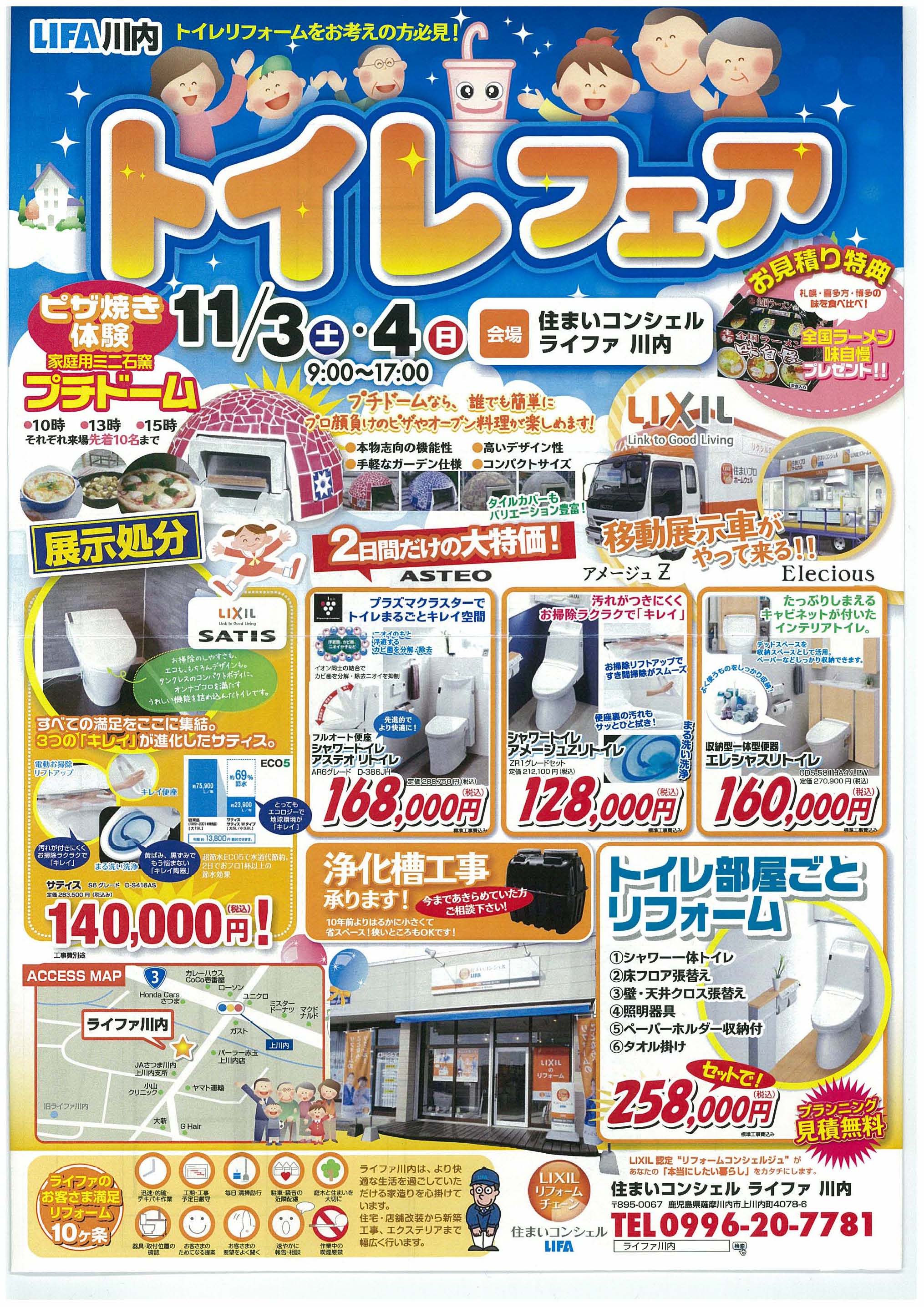 11月3日(土)・4日(日)9:00~17:00に、ライファ川内にて『トイレフェア』を開催いたします。