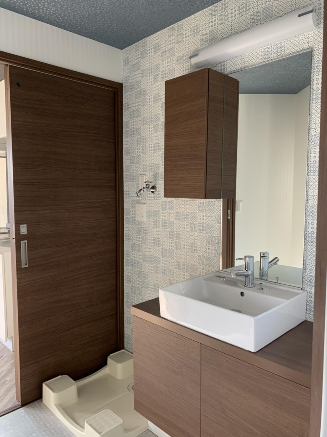 台形の洗面所にLIXILオフトを設置しました。他の化粧台ですと奥行が大きく脱衣スペースが狭くなるのでオフトを採用しました。収納、照明も追加しました。