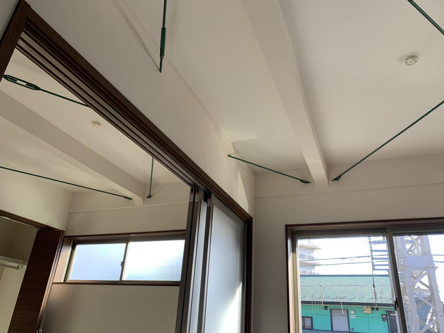 リフォーム前は天井高が2200㎜と低く圧迫感がありました。鉄骨下地の上に木下地を組み、天井を高くしました。ブレスは緑色で塗装してみました。