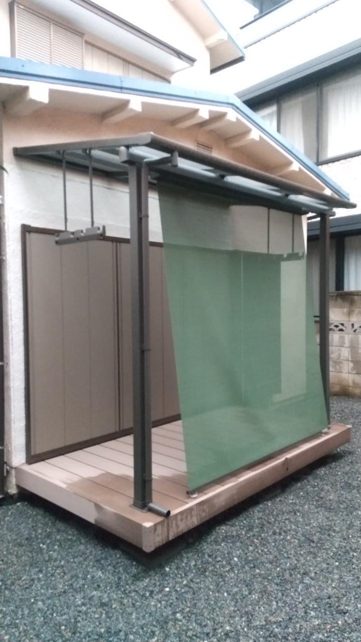戸建てのお庭に元々ありましたテラス囲いが古くなり床も足が抜ける状態でした。それとお庭には物置が2つ。1つは1坪分の現在使われていない小屋の撤去。雑草や庭木も生い茂っている状態。まずはそちらの解体と整地作業をして、防草シートを敷いて砂利仕上げとなりました。LIXILの樹ら楽ステージのウッドデッキ間口1.5間×出幅5尺とLIXILテラス屋根のスピーネを施工させていただきました。洗濯物が干せるように竿掛けと、日除けや目隠しとしてLIXILのスタイルシェードを取付。雨風が強いときはしまえますので便利です。