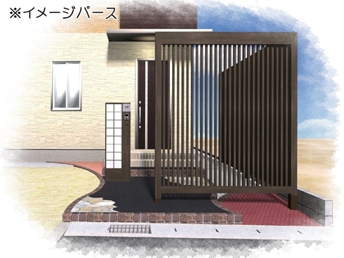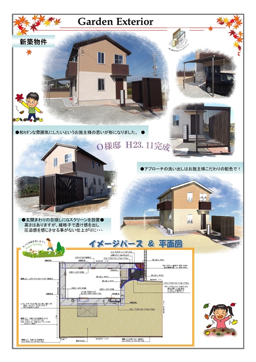 アプローチの洗い出しはO様こだわりの配色で、 和モダンな雰囲気にしたいというO様の思いがカタチになりました。 玄関まわりの目隠しにはGスクリーンを設置。 高さはありますが、縦格子で透け感を出し、圧迫感を感じさせない仕上がりになりました。