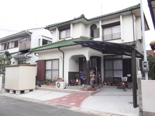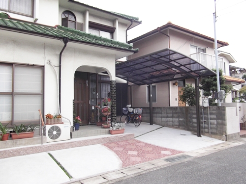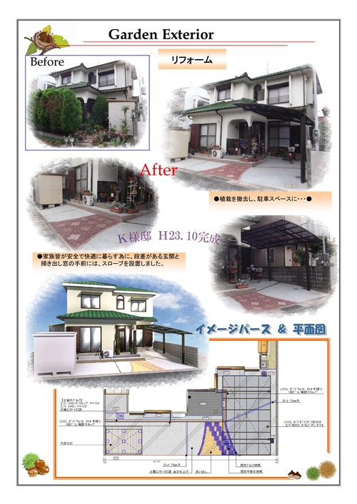植栽を撤去して、駐車場とアプローチに。アプローチは、既存の平板とブロックを再利用しています。 段差がある玄関と掃き出し窓の前には、家族みんなで安全で快適に暮らすため、手すりとスロープを設置しました。