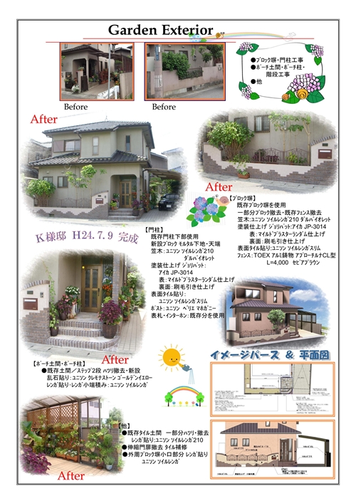 主なリフォーム内容 : 門柱,ブロック塀工事 / 玄関ポーチ柱,アプローチ階段工事