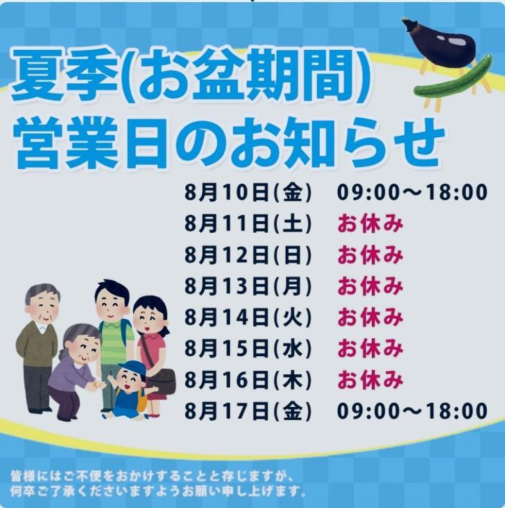 夏季(お盆期間)の営業日のお知らせです。