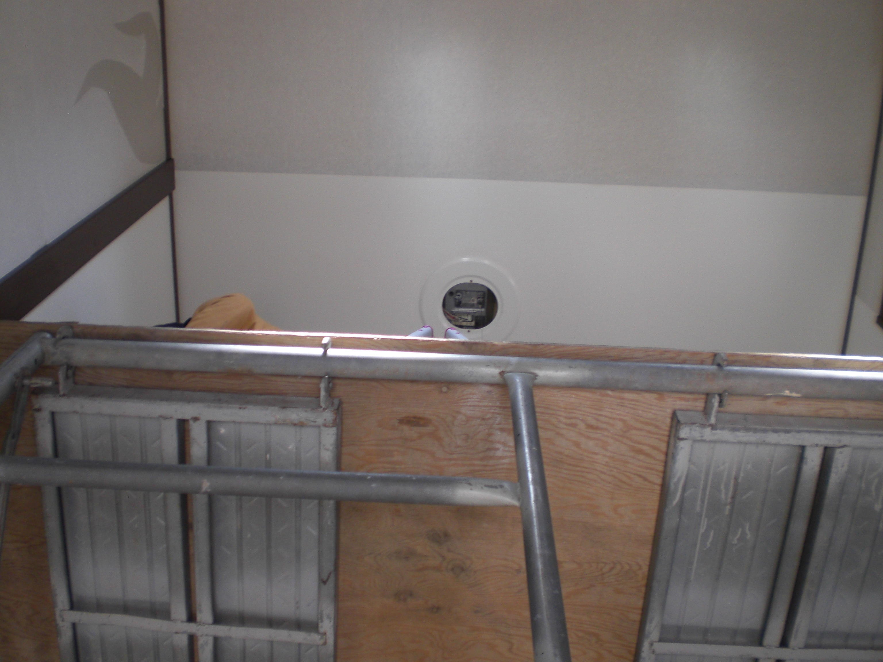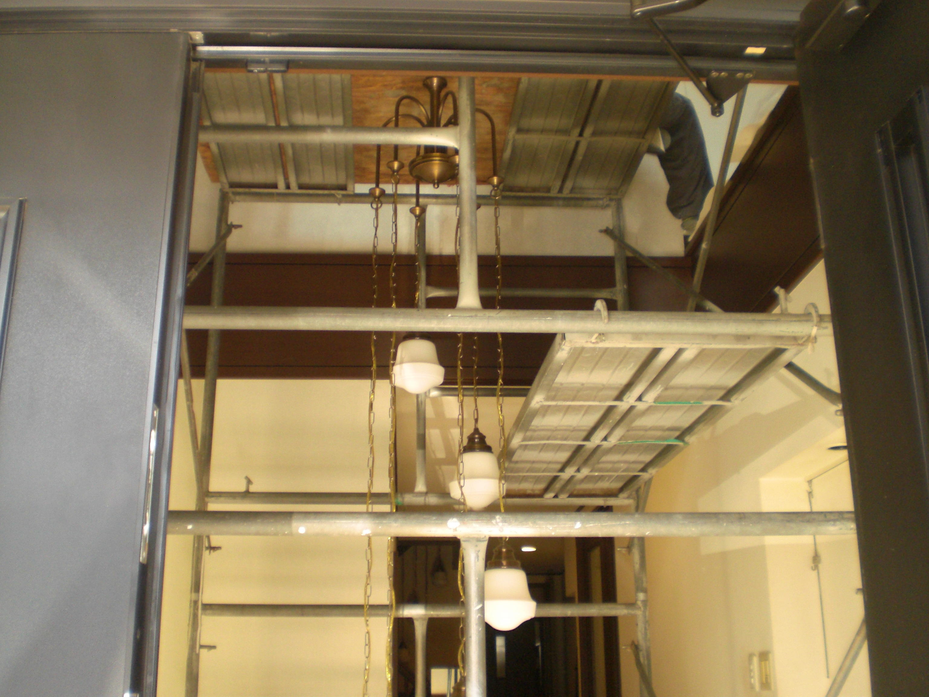 立派なシャンデリアのある吹き抜けに足場を組んでクロスを貼り換えました。