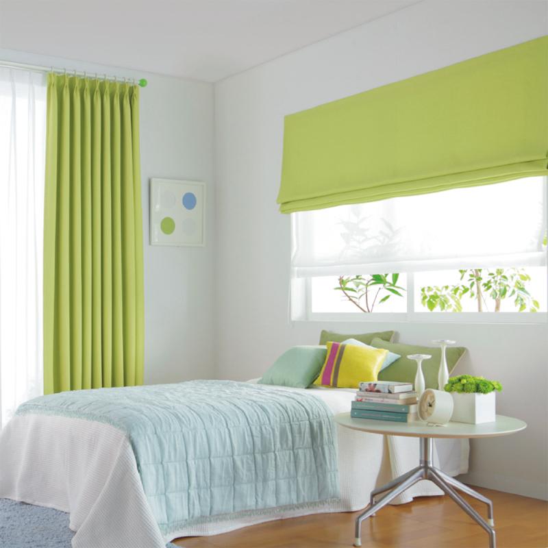 シェードの良いところは、カーテンと同じ生地を使用できることです。お値段もロールカーテンよりも安価です。