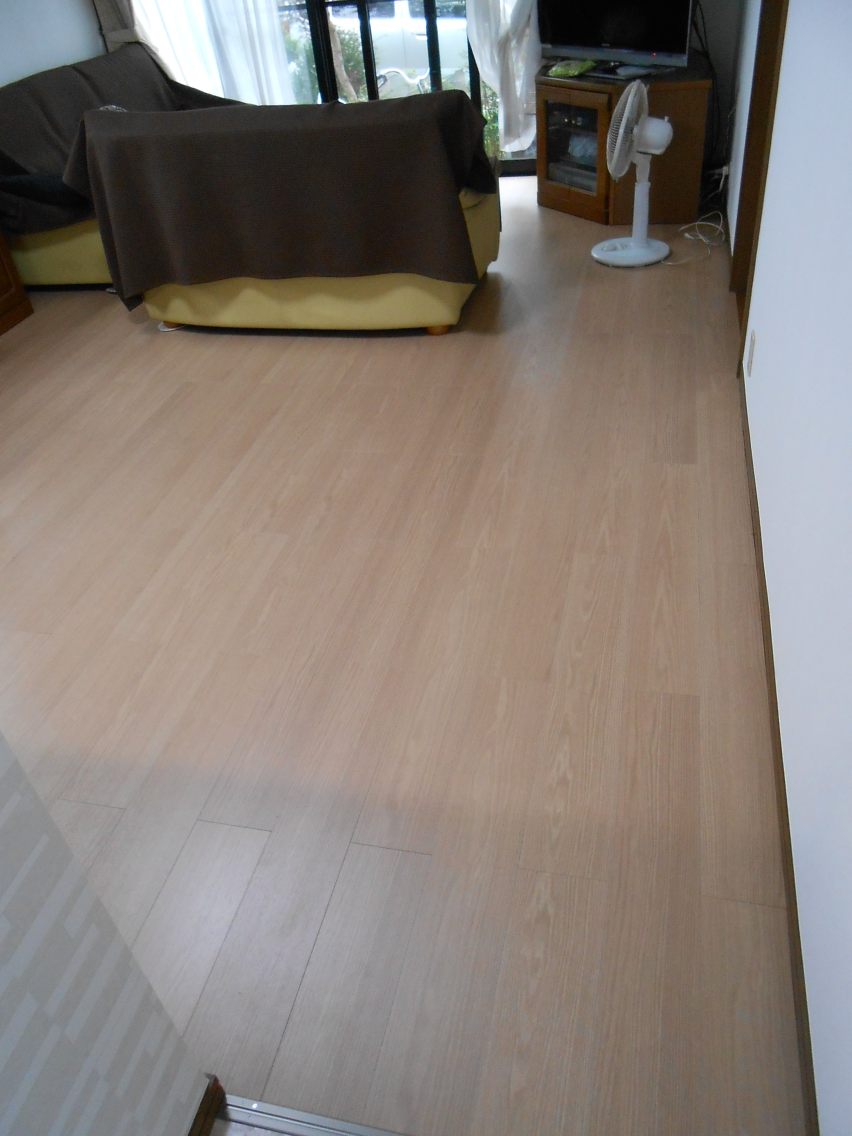 残念ながら木材ではありませんが、表面は硬くしっかりしていまして、見た目はフローリングと同じ仕上がりになります。貼り方は強力両面テープです。