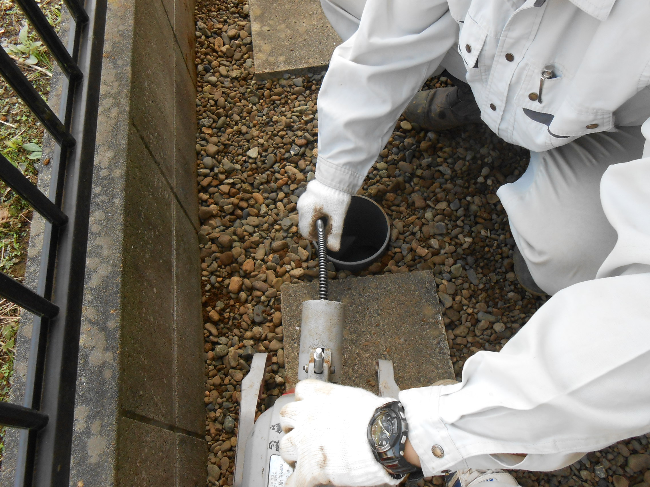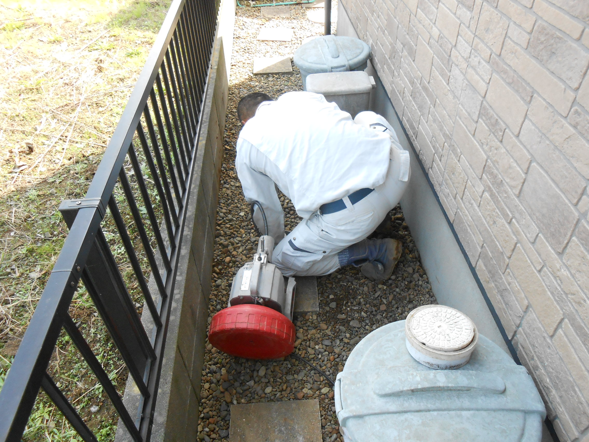 配管の中に管を入れて詰まった油を取り除いていきます。